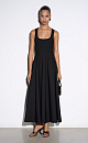 This midi-length knit viscose dress features a fitted silhouette, a flared skirt with soft pleats, sleeveless design, wide straps, and a square neckline.