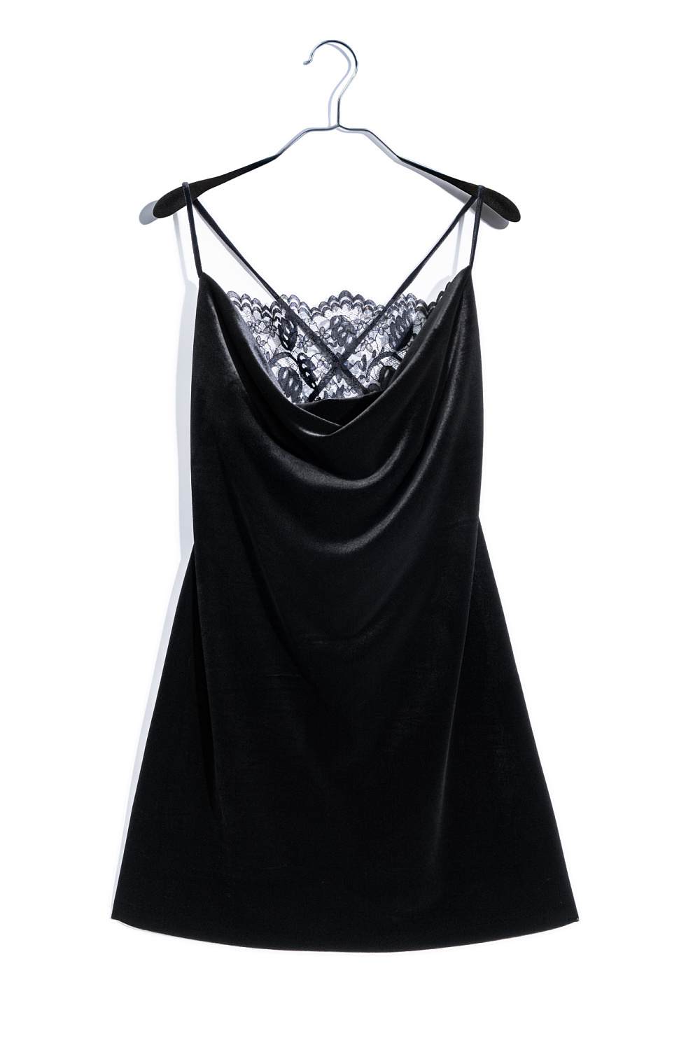 Mini length velvet evening dress. Model of a fitted silhouette with thin straps. The bodice of the product is decorated with thin lace.