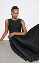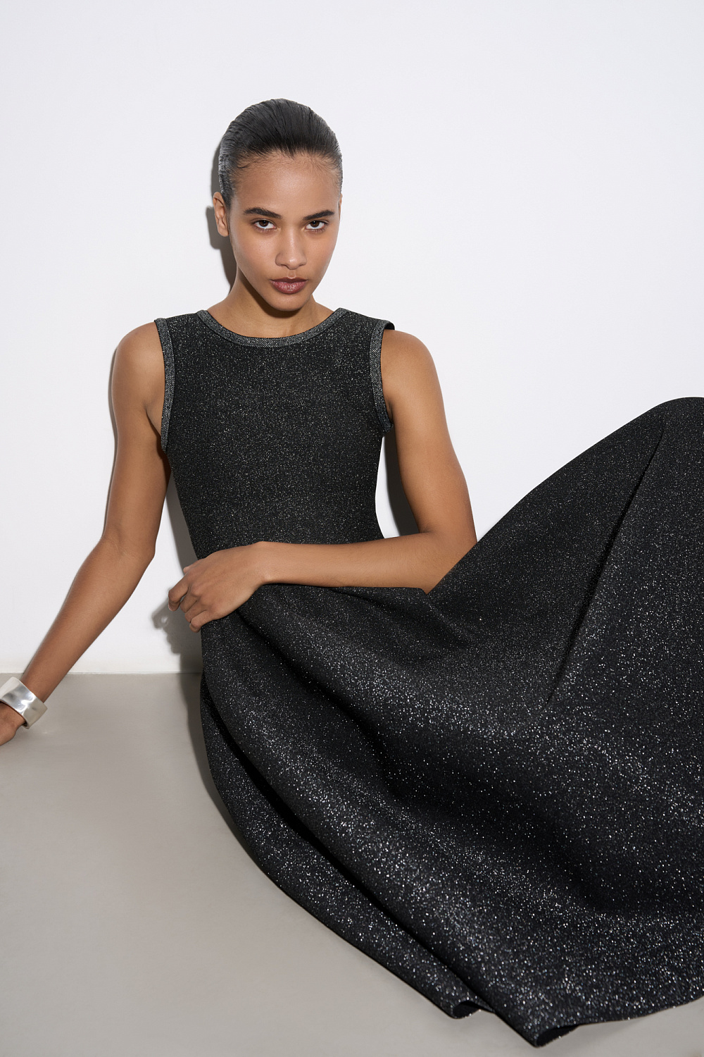 Knitted midi-length dress with lurex. A fitted model with a skirt flared from the waist, sleeveless, with wide straps.
