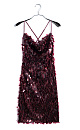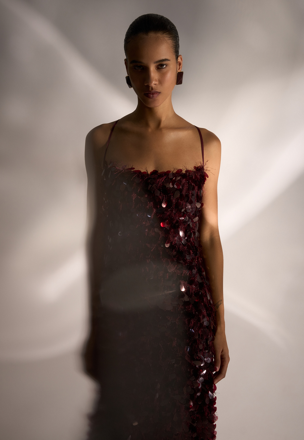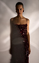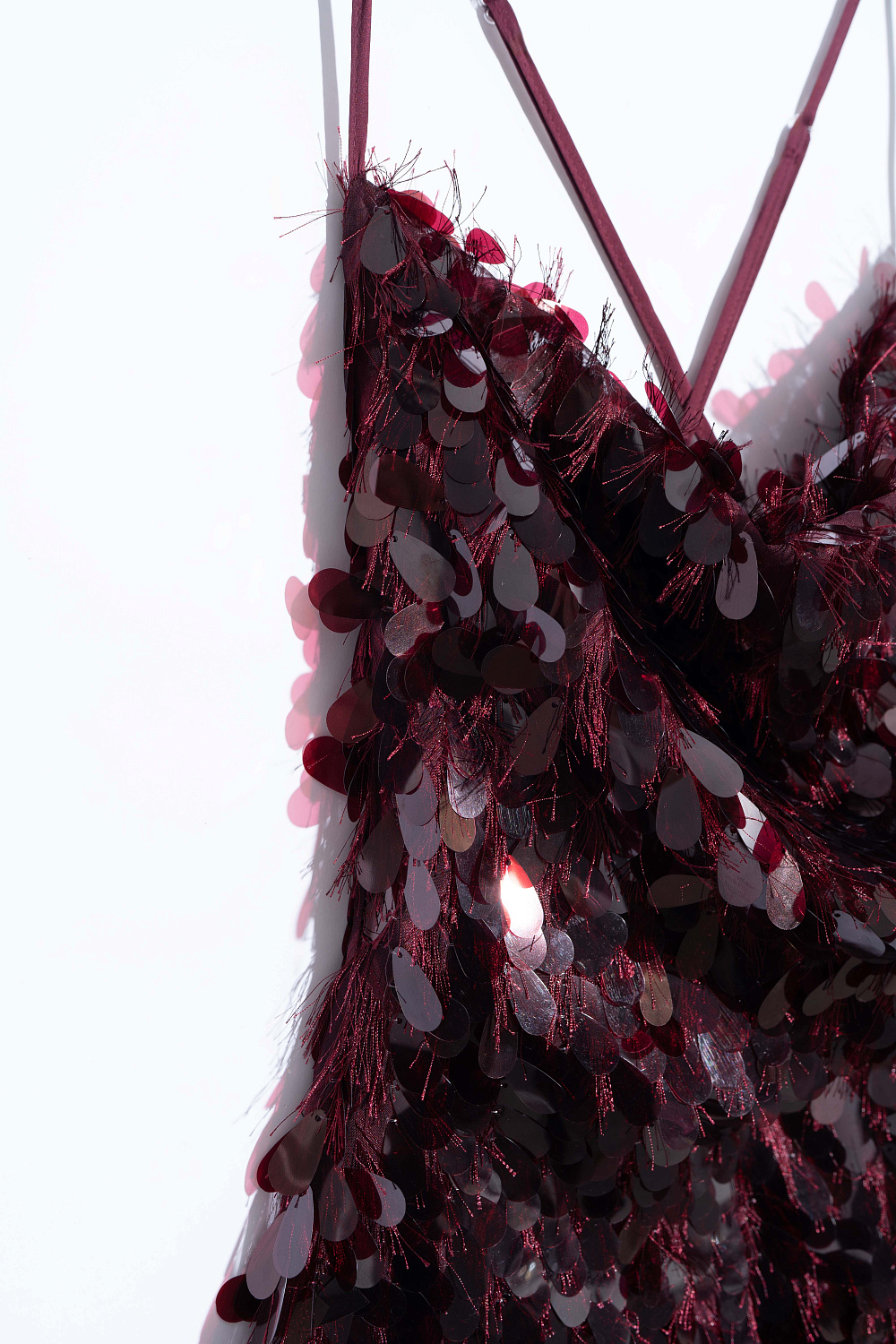 Evening sheath dress of midi length, decorated with sequins and fringe. Fitted model with thin adjustable straps.