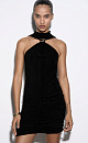 Mini-length evening dress made of velvety viscose. The model has a fitted, sleeveless silhouette, with an American armhole, jumper at the neck and draping at the hips.