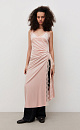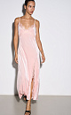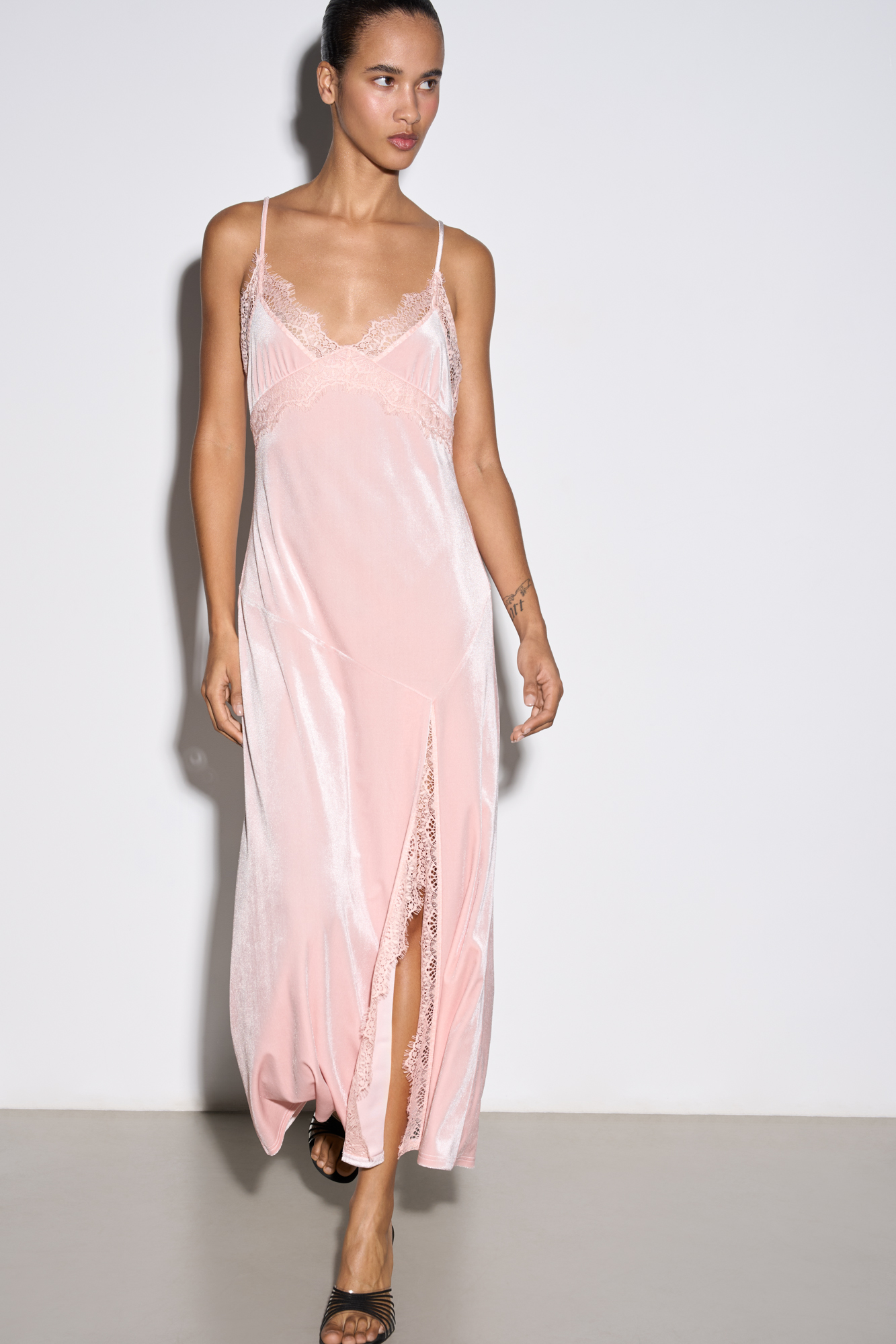 Maxi length slip dress in velvet viscose. The model has a fitted silhouette with thin straps and a high slit on the side. The product is decorated with lace.
