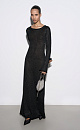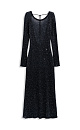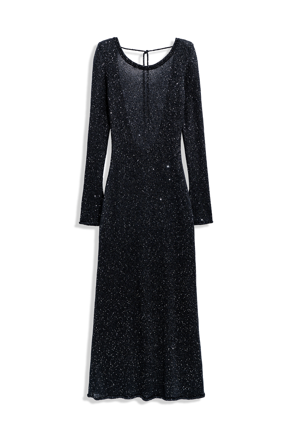 Knitted maxi length cotton dress with sequins. Model of a fitted silhouette with long sleeves and an open back. The sleeve cuffs and hem are decorated with bolsters.