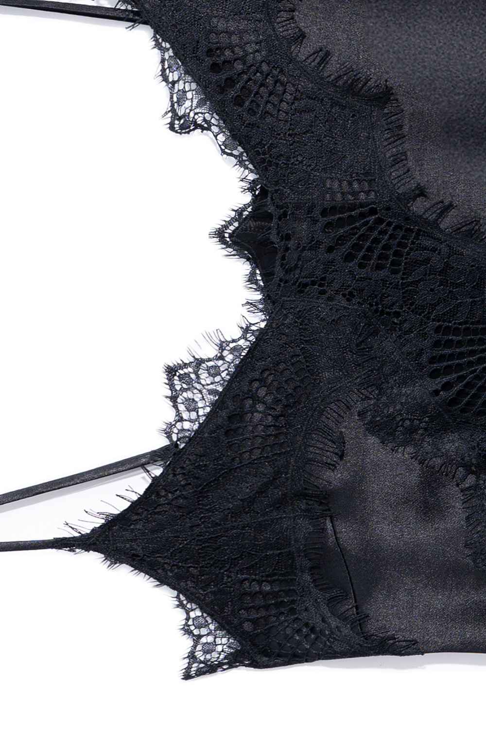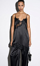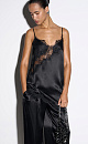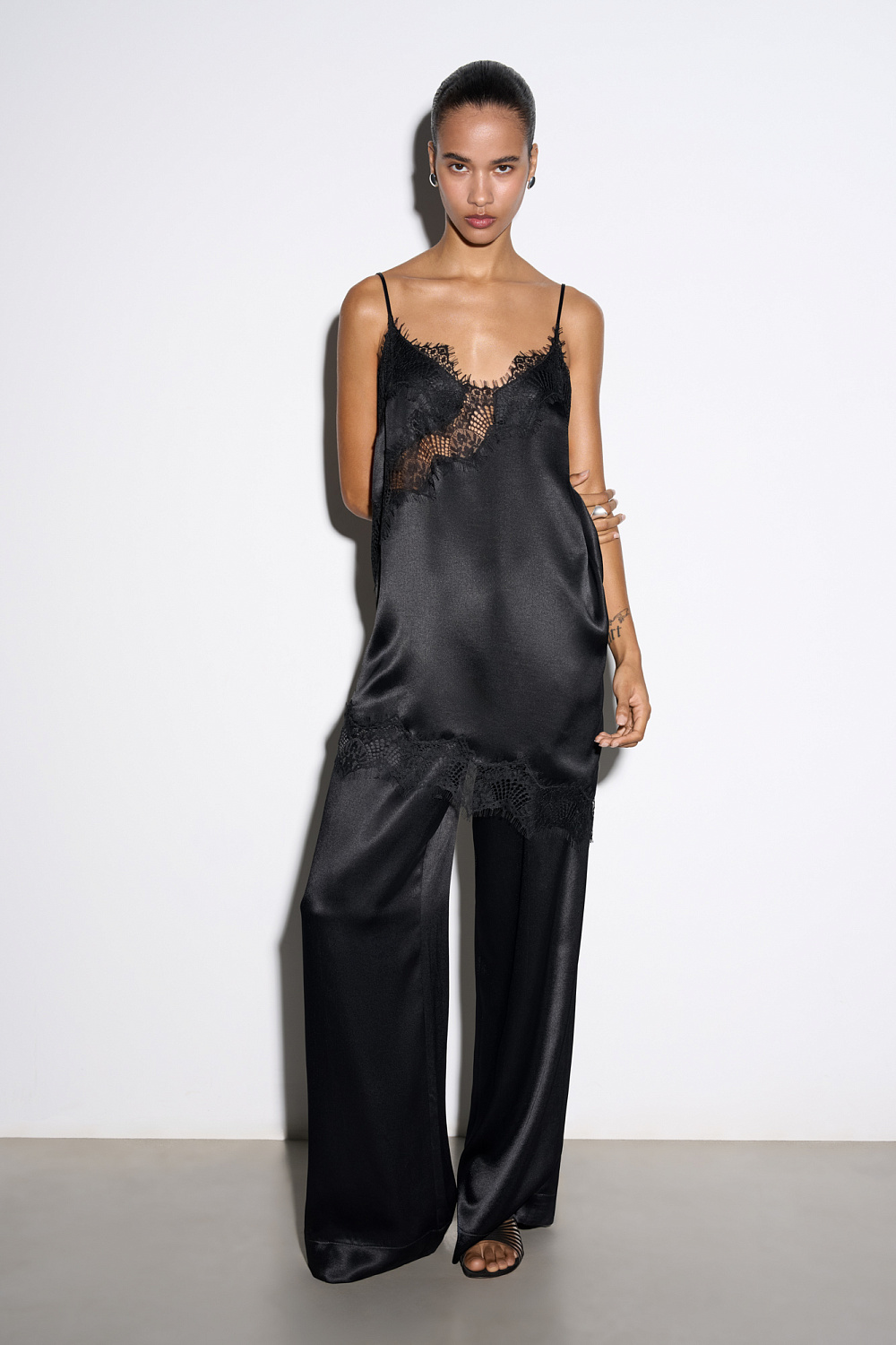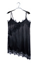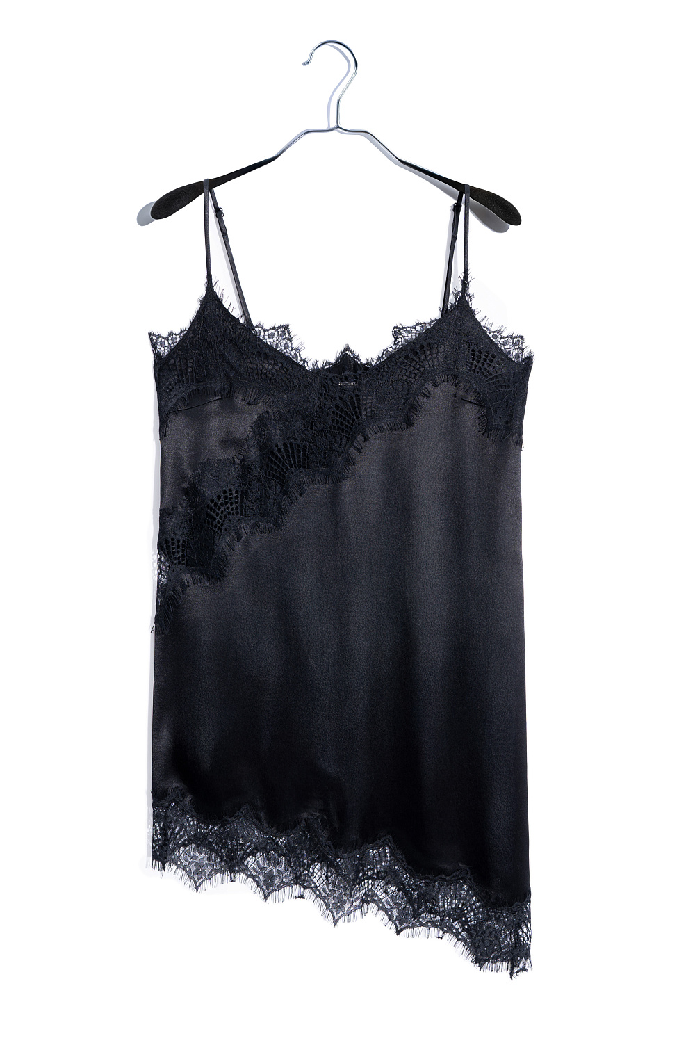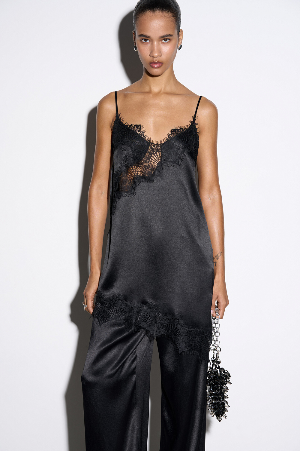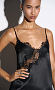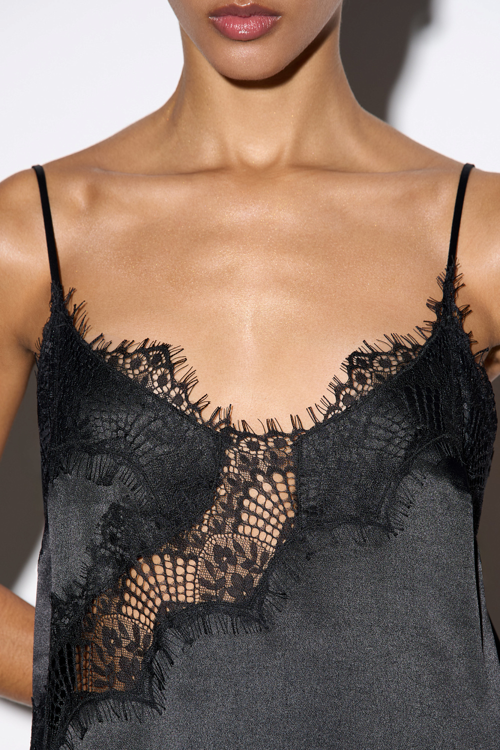 Mini length slip dress made of 100% viscose. Model with thin straps. The hem and bodice of the product are decorated with thin lace in a contrasting color.