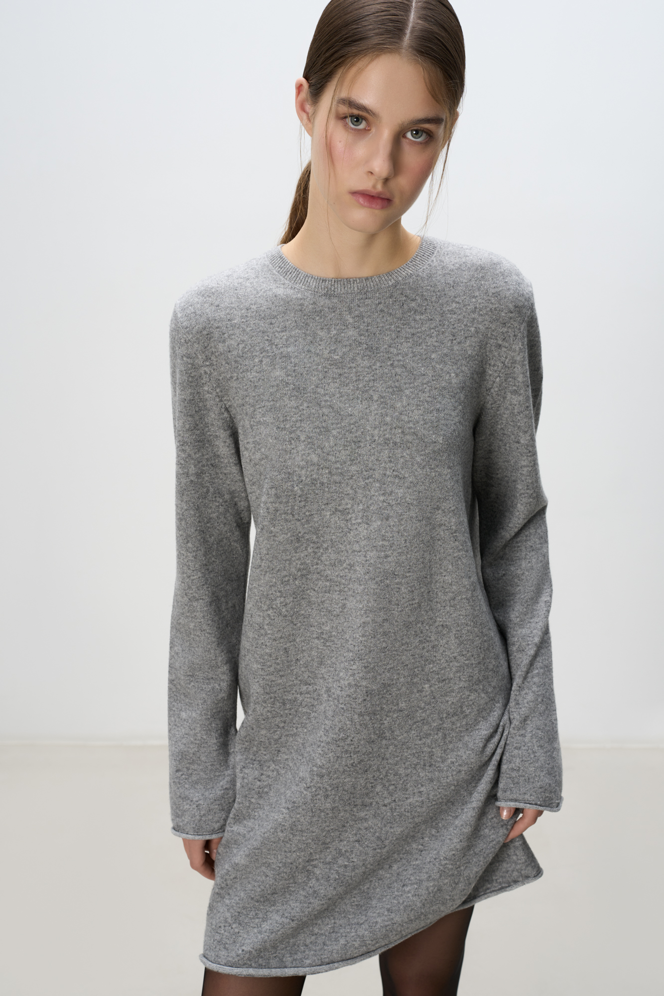 Knitted mini-length dress made of wool with the addition of cashmere. The model has a loose silhouette with long sleeves, a round neckline and a roll at the bottom of the product.