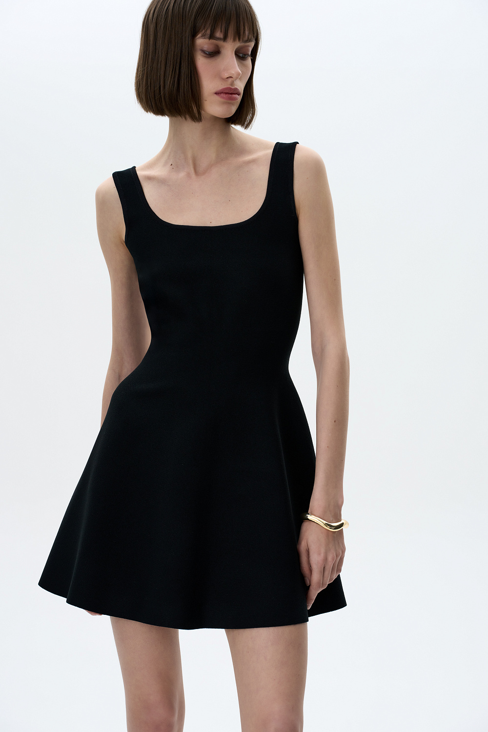 Knit mini dress with wide straps. Round neckline, back zip fastening. The dress is knitted from thick elastic viscose, has a tight silhouette and retains the volume of the skirt.