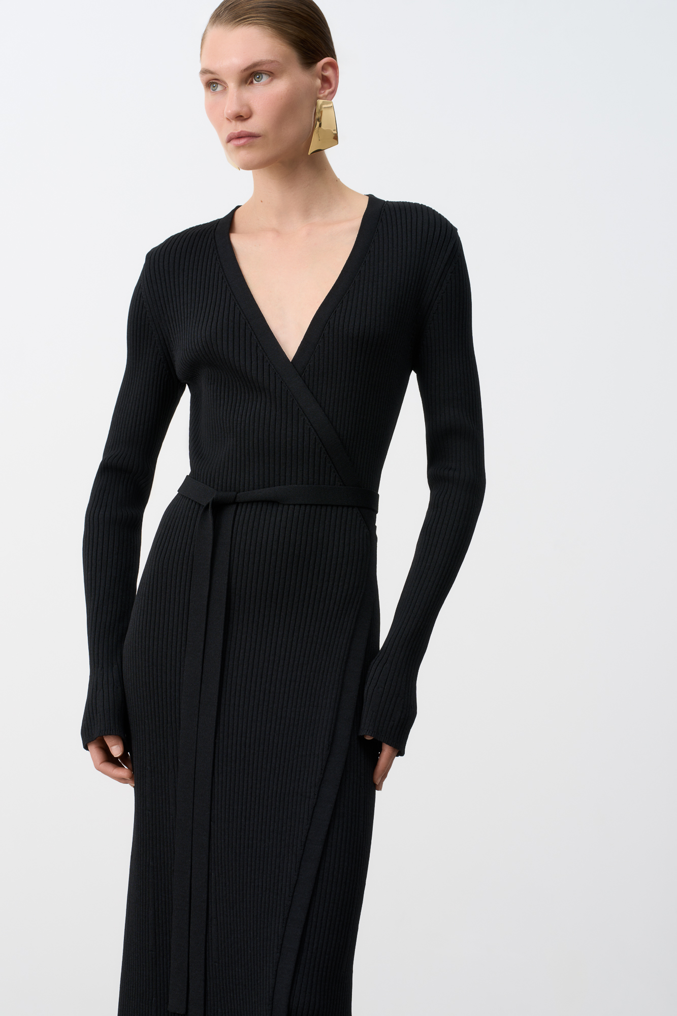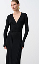 Calf-length cardigan dress in soft viscose with long flared sleeves and tie belt.