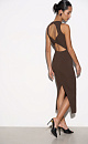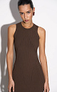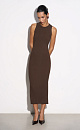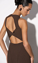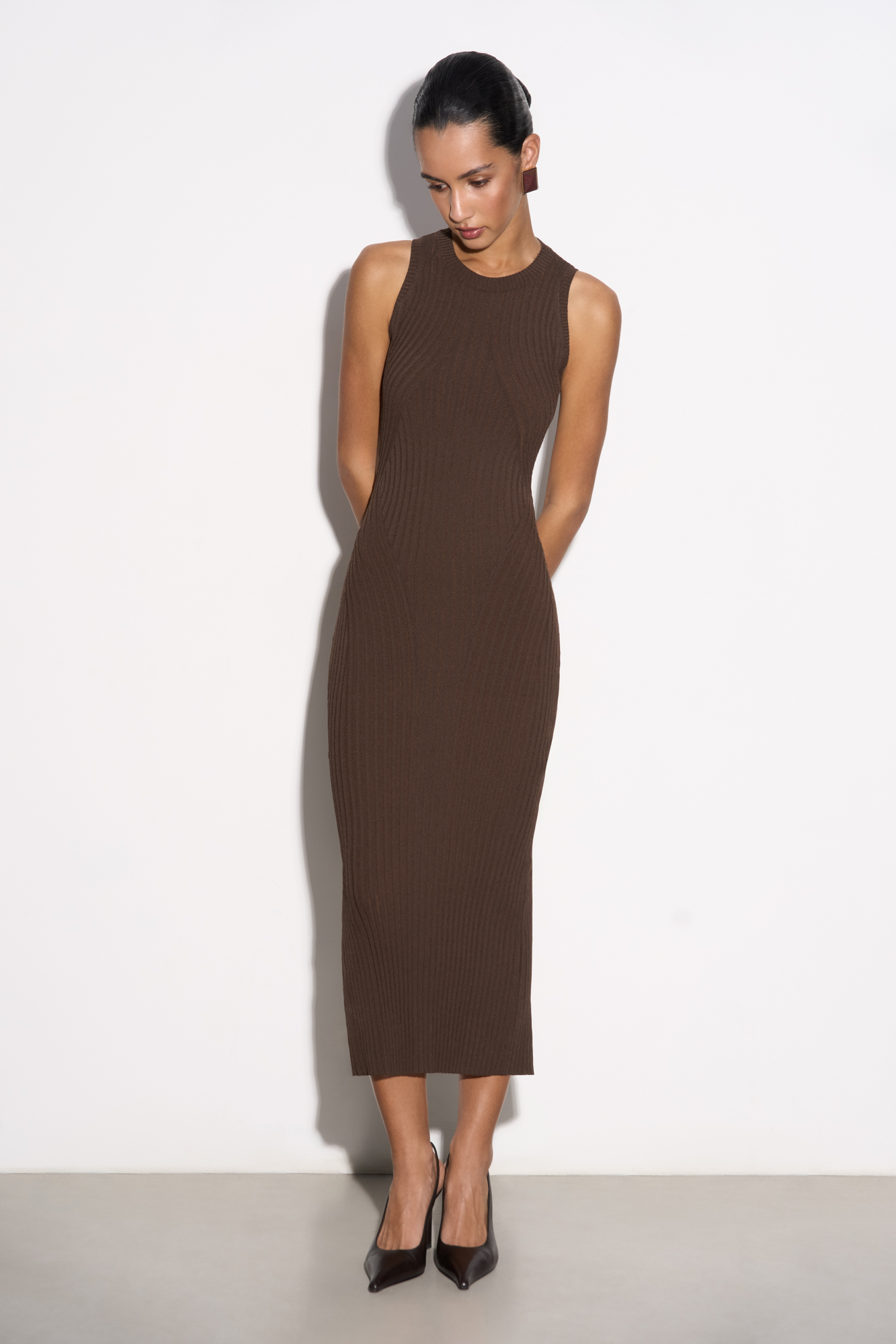 Sleeveless knitted dress. Fitted silhouette, slit and a twisted back.