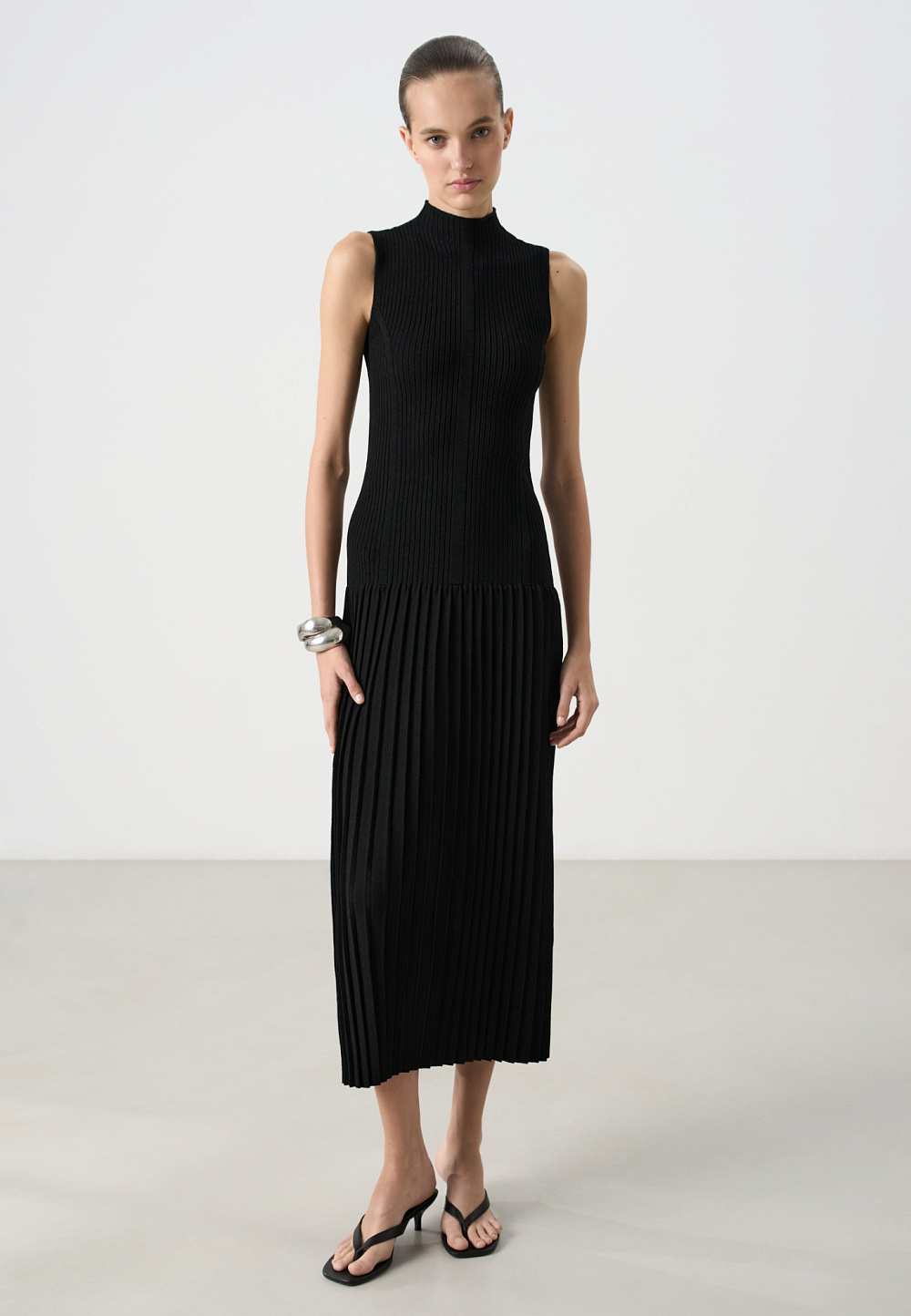 A maxi-length knit viscose dress. It features a fitted, sleeveless silhouette, a low stand-up collar, and a pleated skirt that falls below the hips.