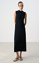 A midi-length knit dress made of viscose. It features a fitted silhouette, sleeveless design, and a low stand-up collar.