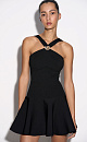 Knitted mini-length dress made of viscose. The model has a fitted silhouette with wide straps crossed on the bodice and decorated with a shell-shaped buckle. The product has an open back, a knitted bodice and a circle skirt.