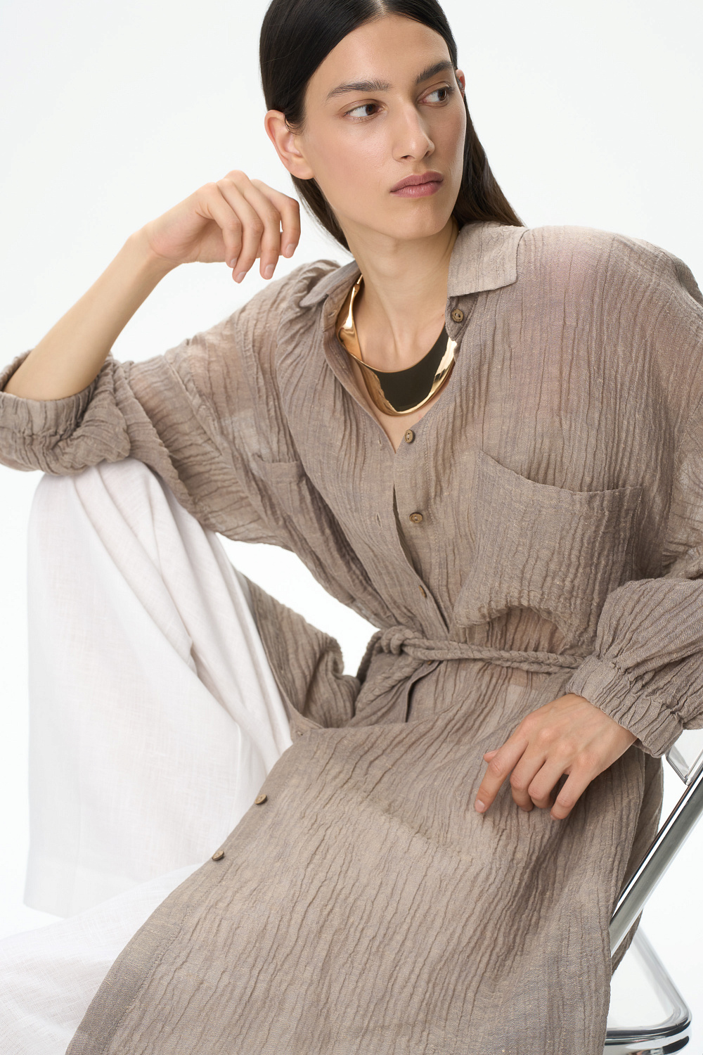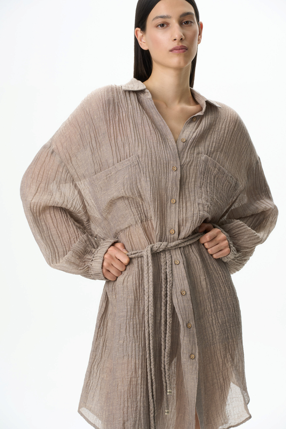 Shirt dress with patch pockets on the chest. Features loose silhouette with dropped shoulders and a matching tie belt.