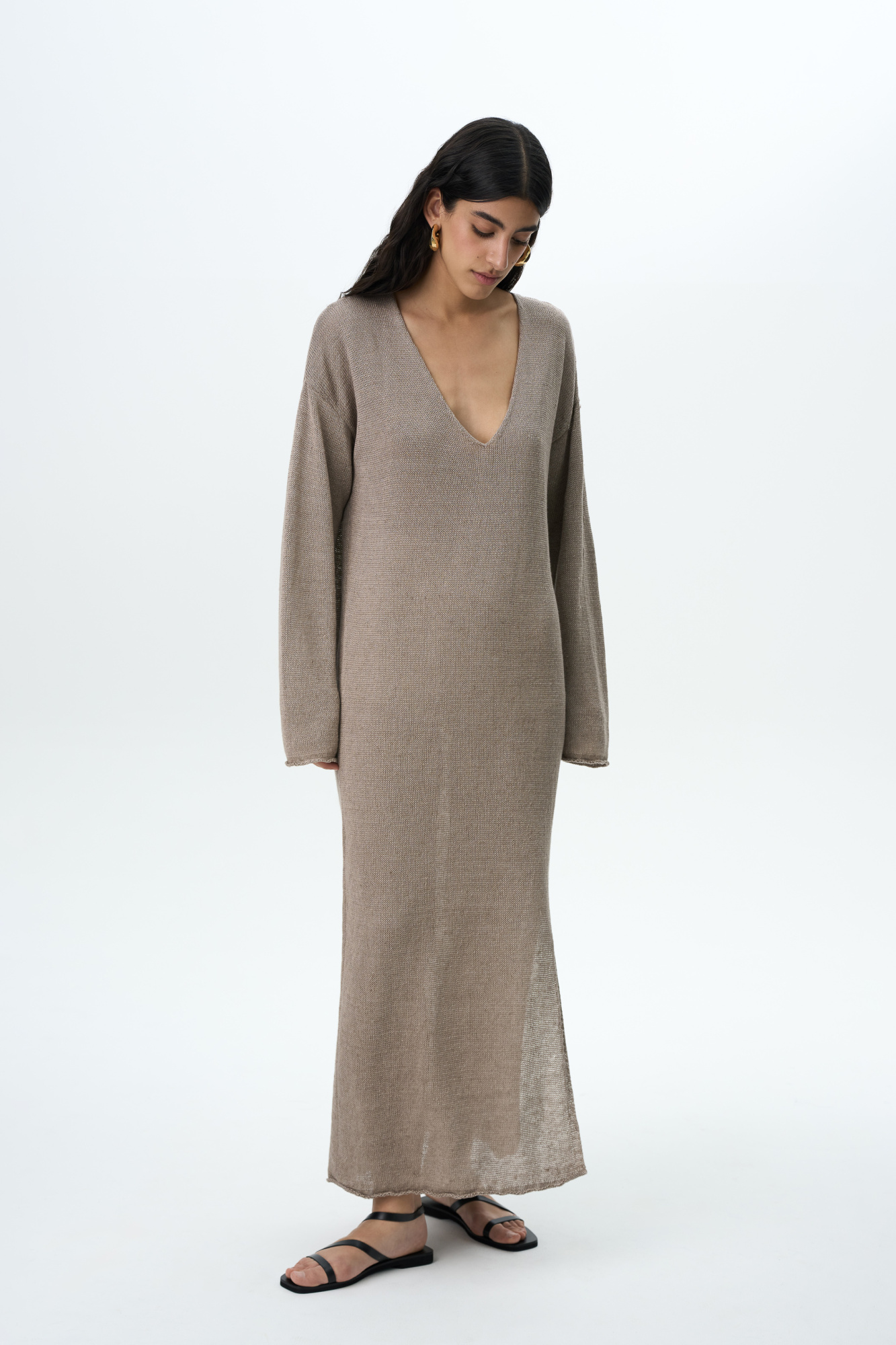 Linen dress with V-neck and front slit.