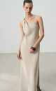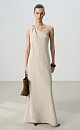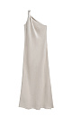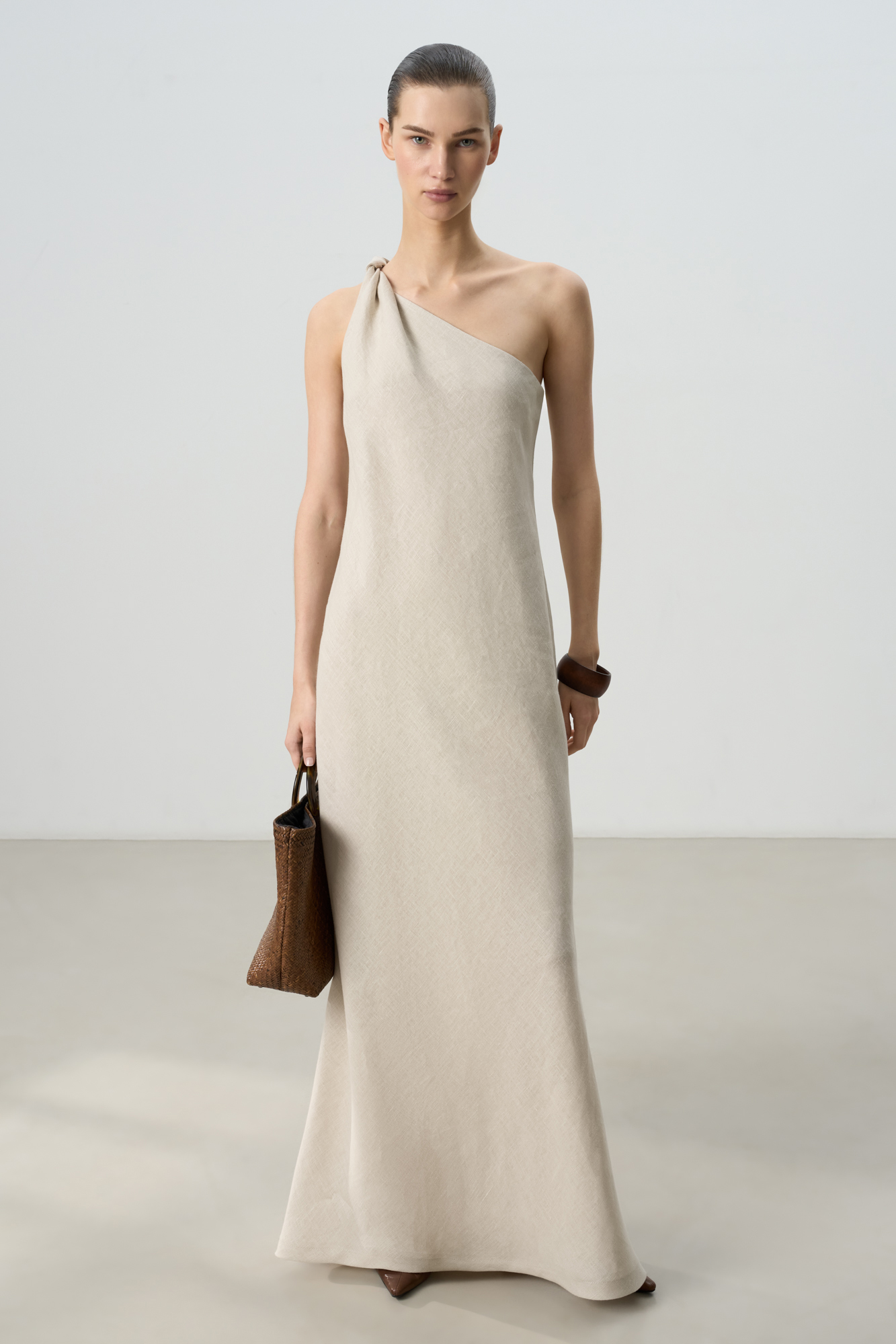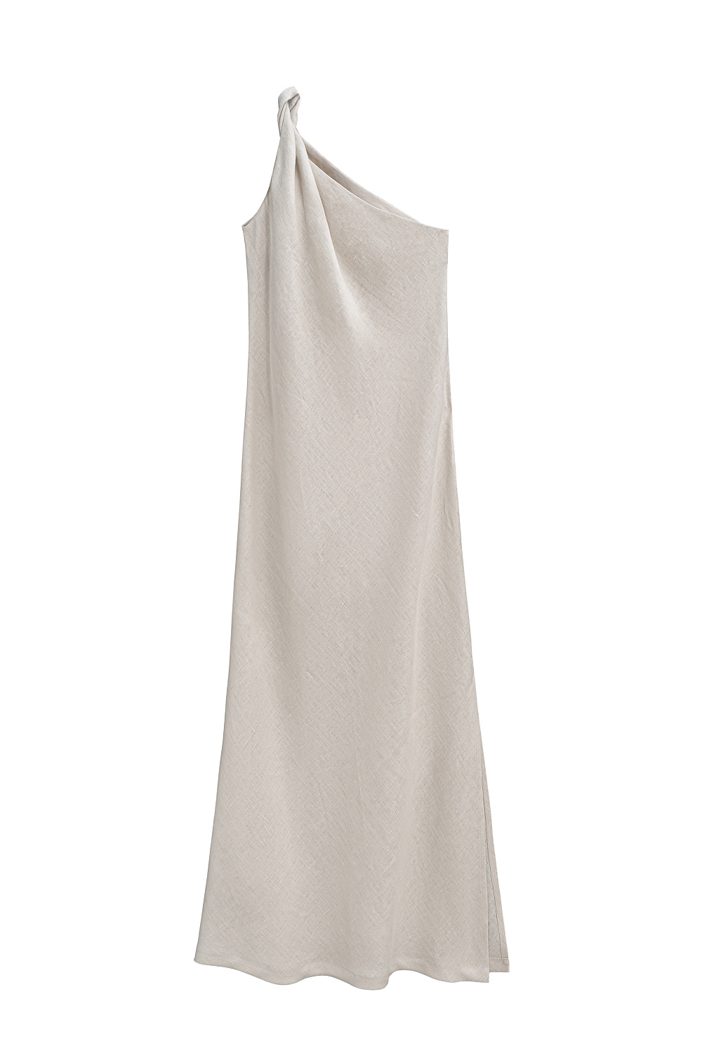 Maxi length dress made of 100% linen. The model has an asymmetrical cut, with a twisted strap on one shoulder. Side slit.