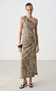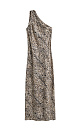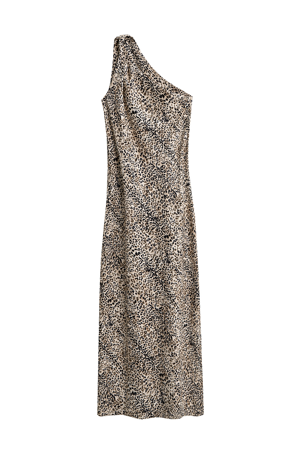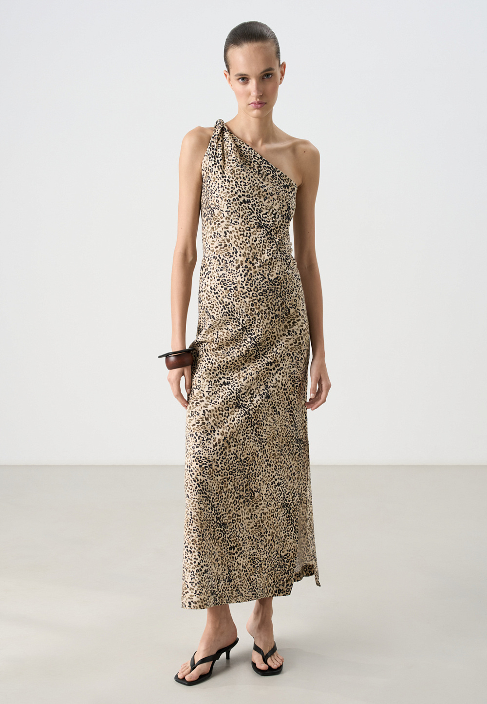 Midi-length dress with animal print made of linen with added viscose. The model has a loose fit, with a wide strap on one shoulder, decorated with drapery.