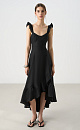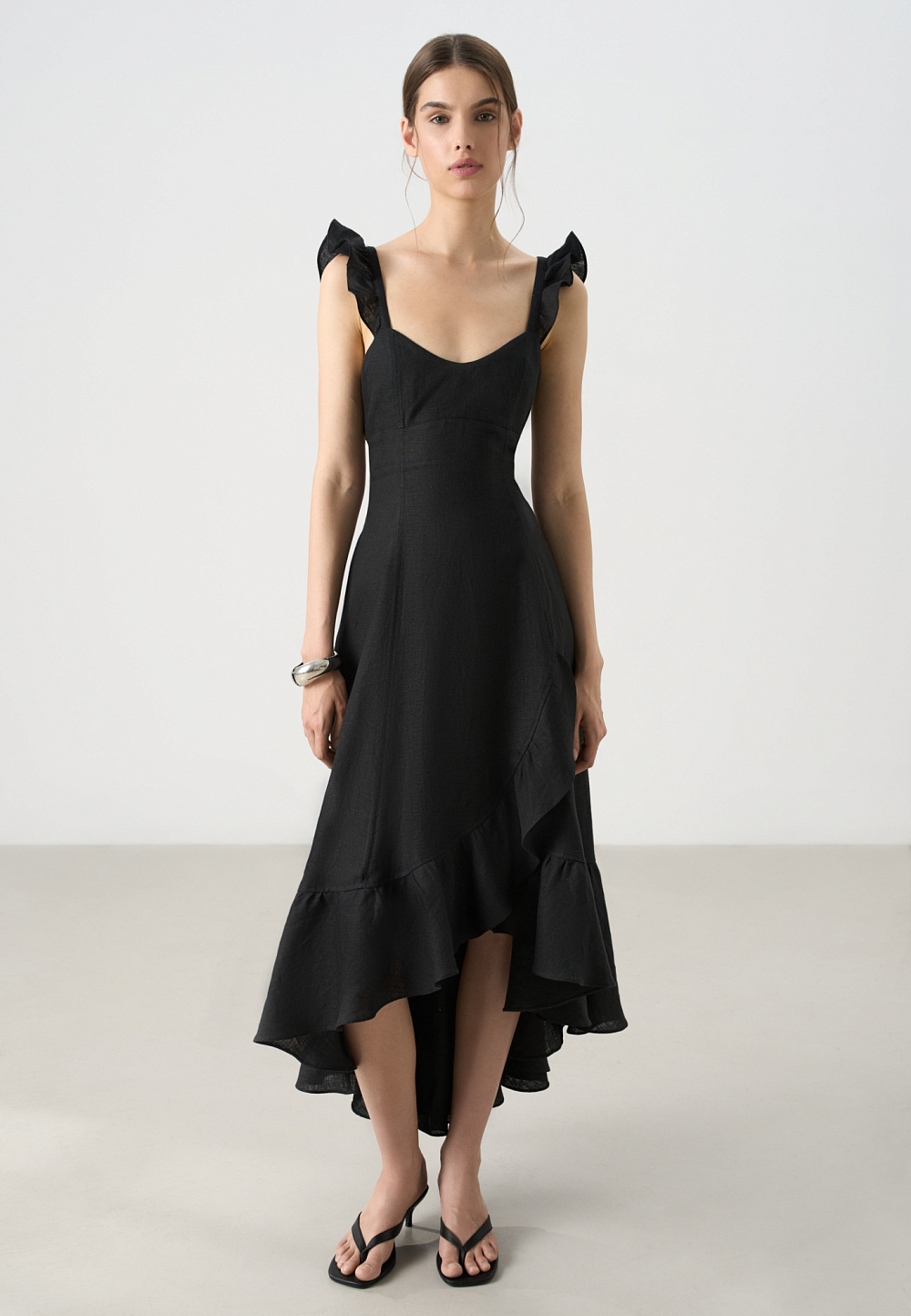 Linen midi sundress with an open back and asymmetric ruffle trim.