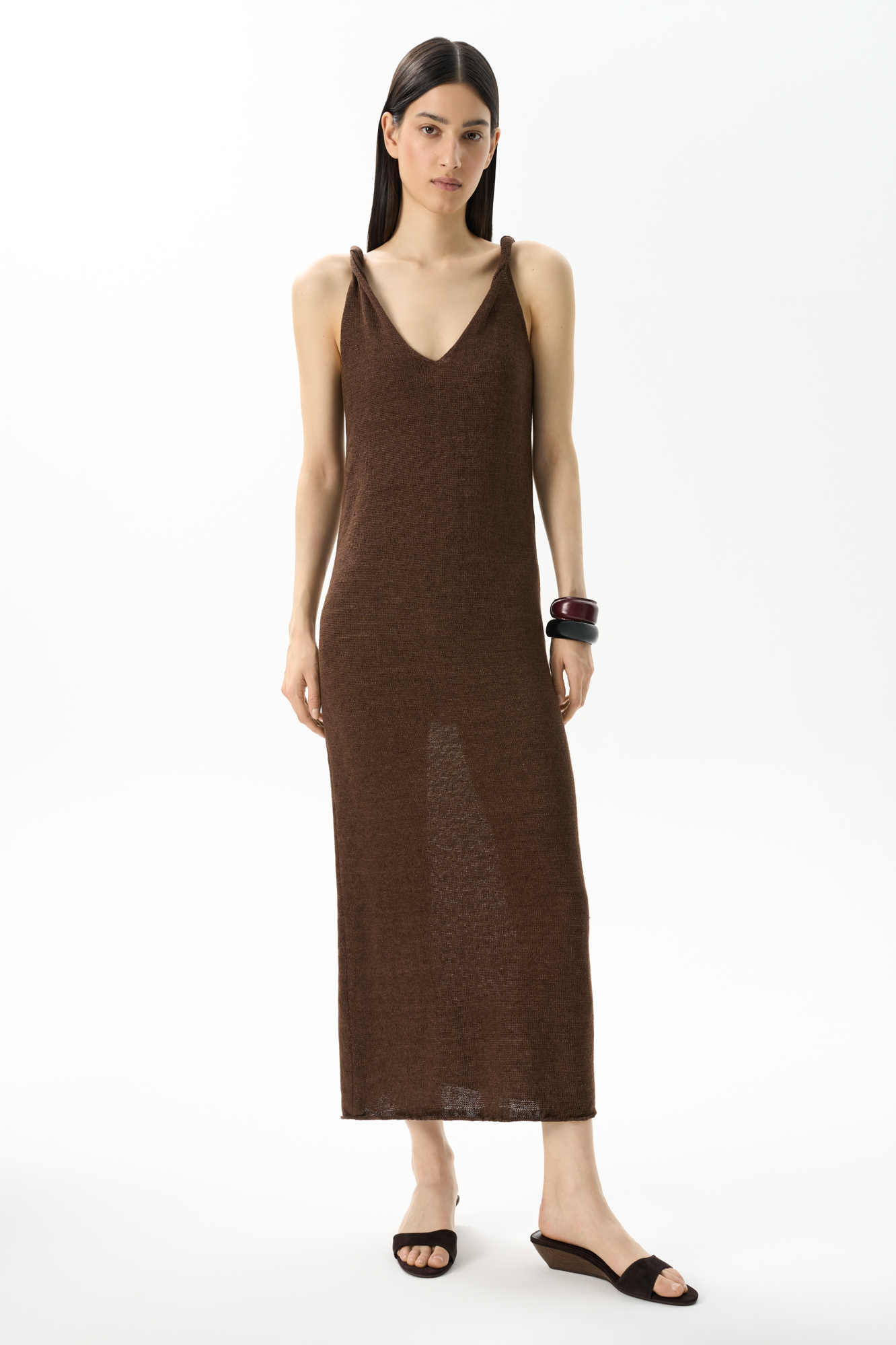 Maxi length sundress made of 100% linen. Straight fit model with twisted straps and V-neck.