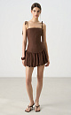 Mini-length dress made of 100% linen with a balloon skirt. The model has a fitted silhouette, with a corset top, and thin straps decorated with large beads. The back of the product is made with elastic.