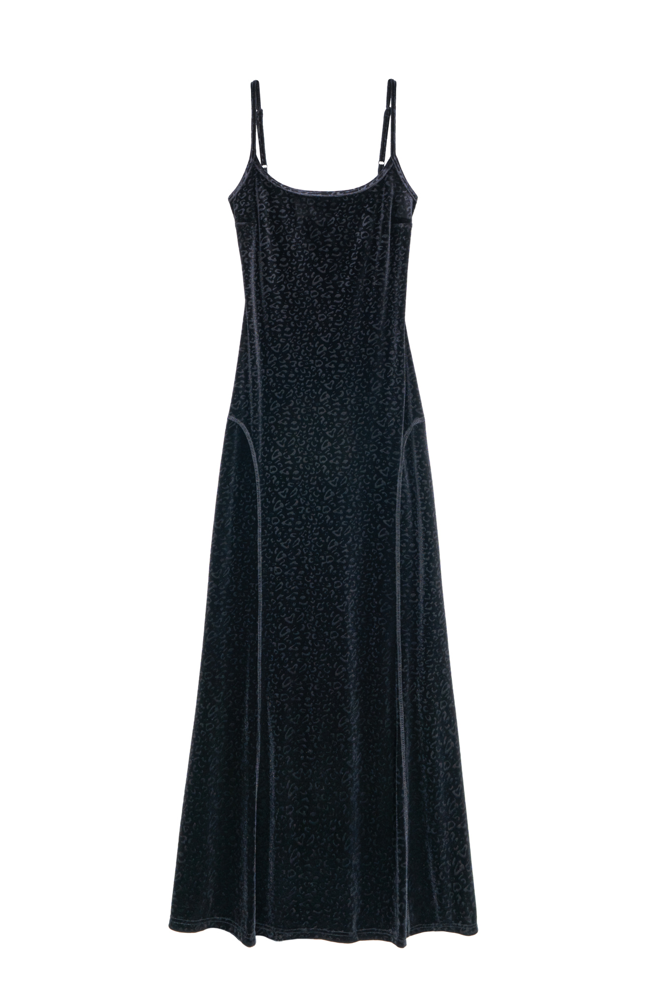 Velvet maxi dress with animal print. Fitted silhouette with thin adjustable straps.