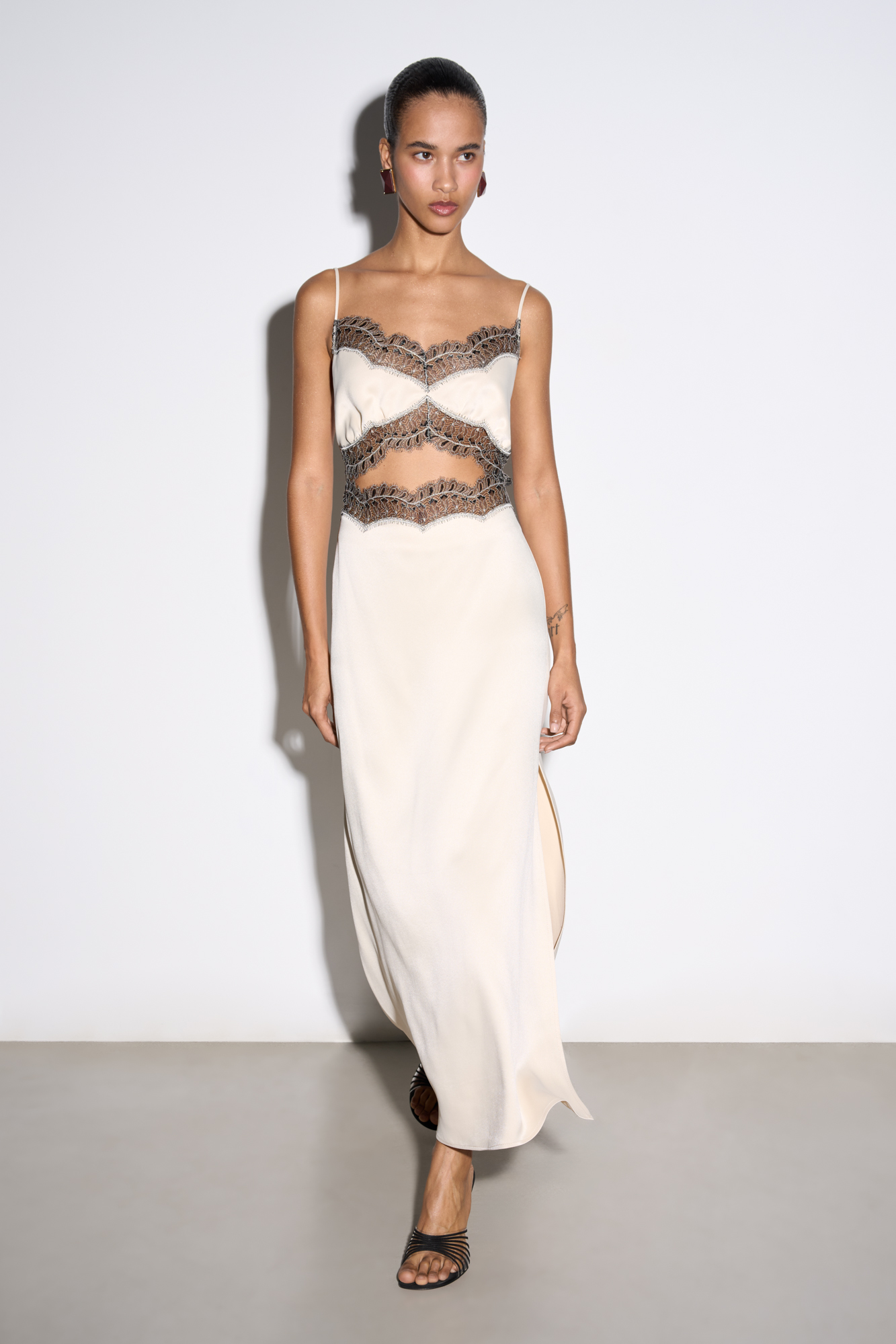 Satin maxi length dress decorated with lace. The model has a fitted silhouette with thin straps, an open back and a cutout under the bust. Concealed zip fastening.