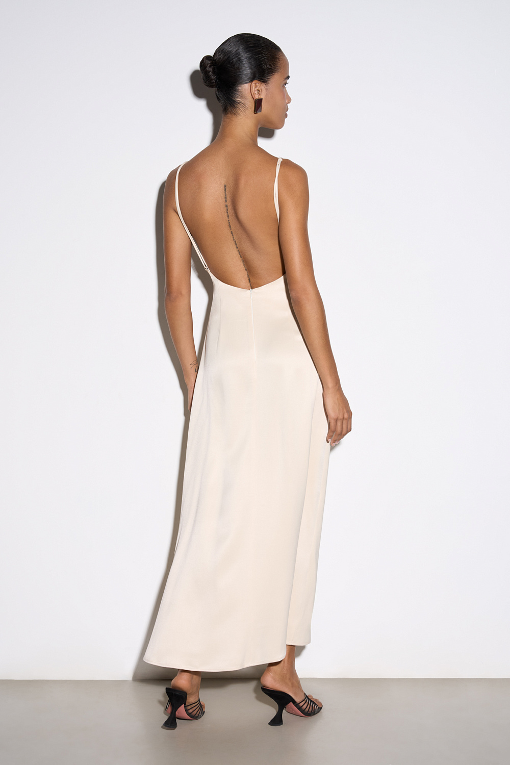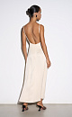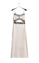 Satin maxi length dress decorated with lace. The model has a fitted silhouette with thin straps, an open back and a cutout under the bust. Concealed zip fastening.