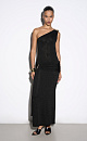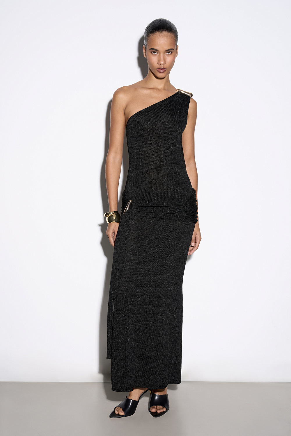 Maxi-length evening dress made of viscose with lurex. Model with an asymmetrical cut. The product is decorated with a wide jumper on the shoulder and a draped bandage on the hips.