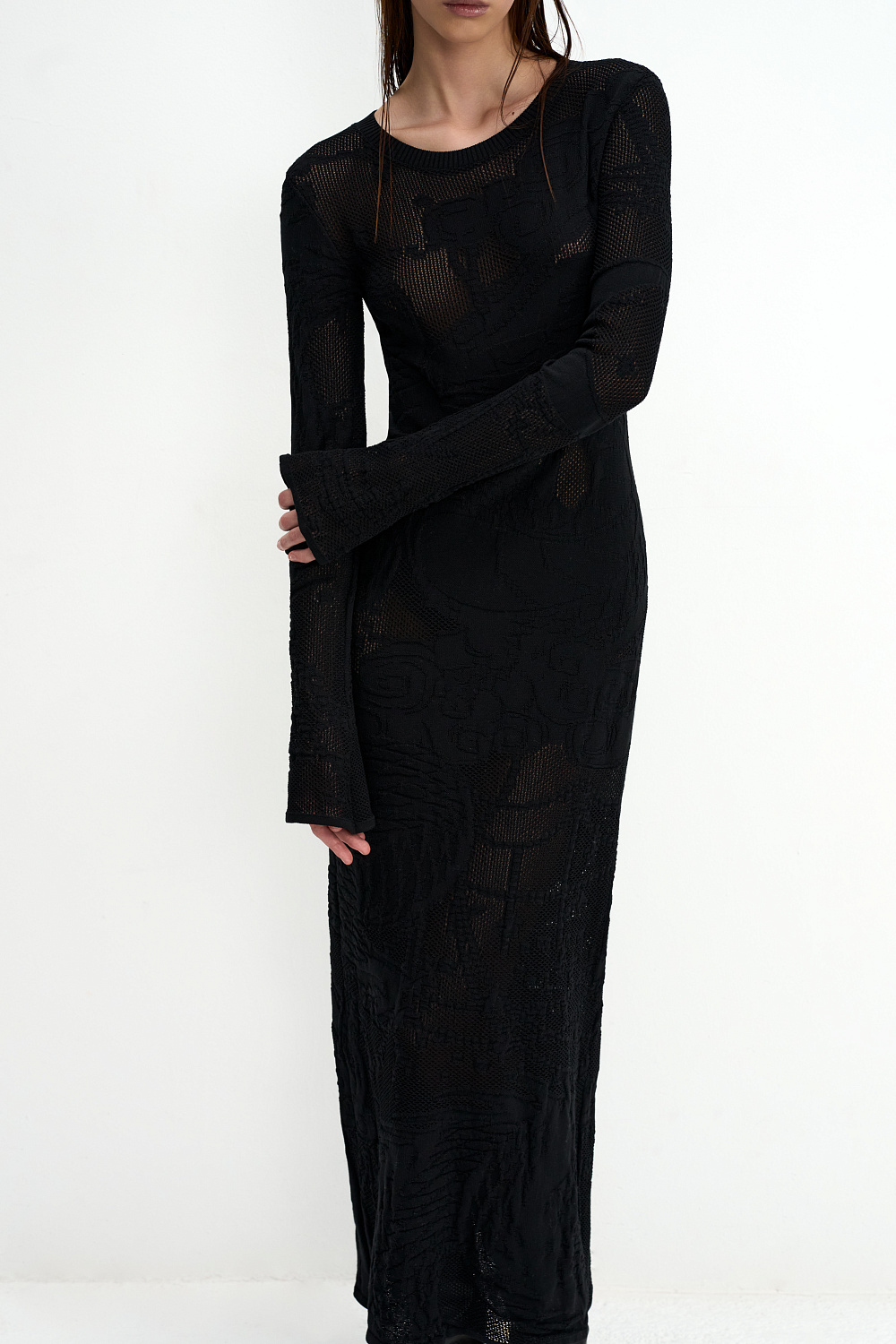 Cotton knitted dress. A fitted silhouette with a round neckline and a jacquard dragon pattern.