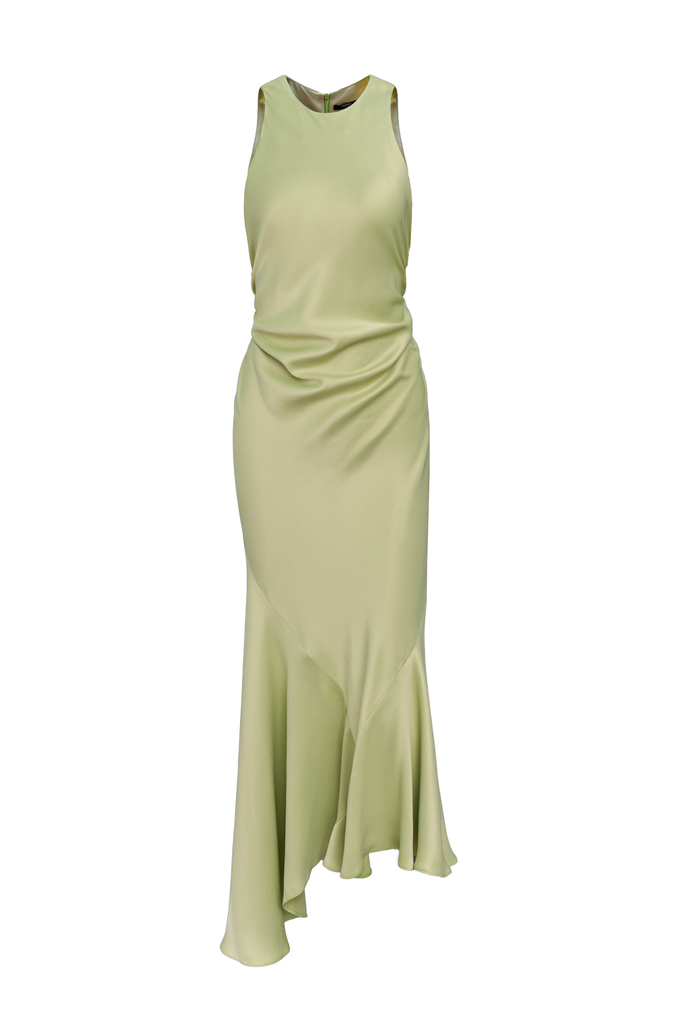 Satin midi dress with asymmetrical hem and gathered waist. Invisible zip fastening.
