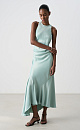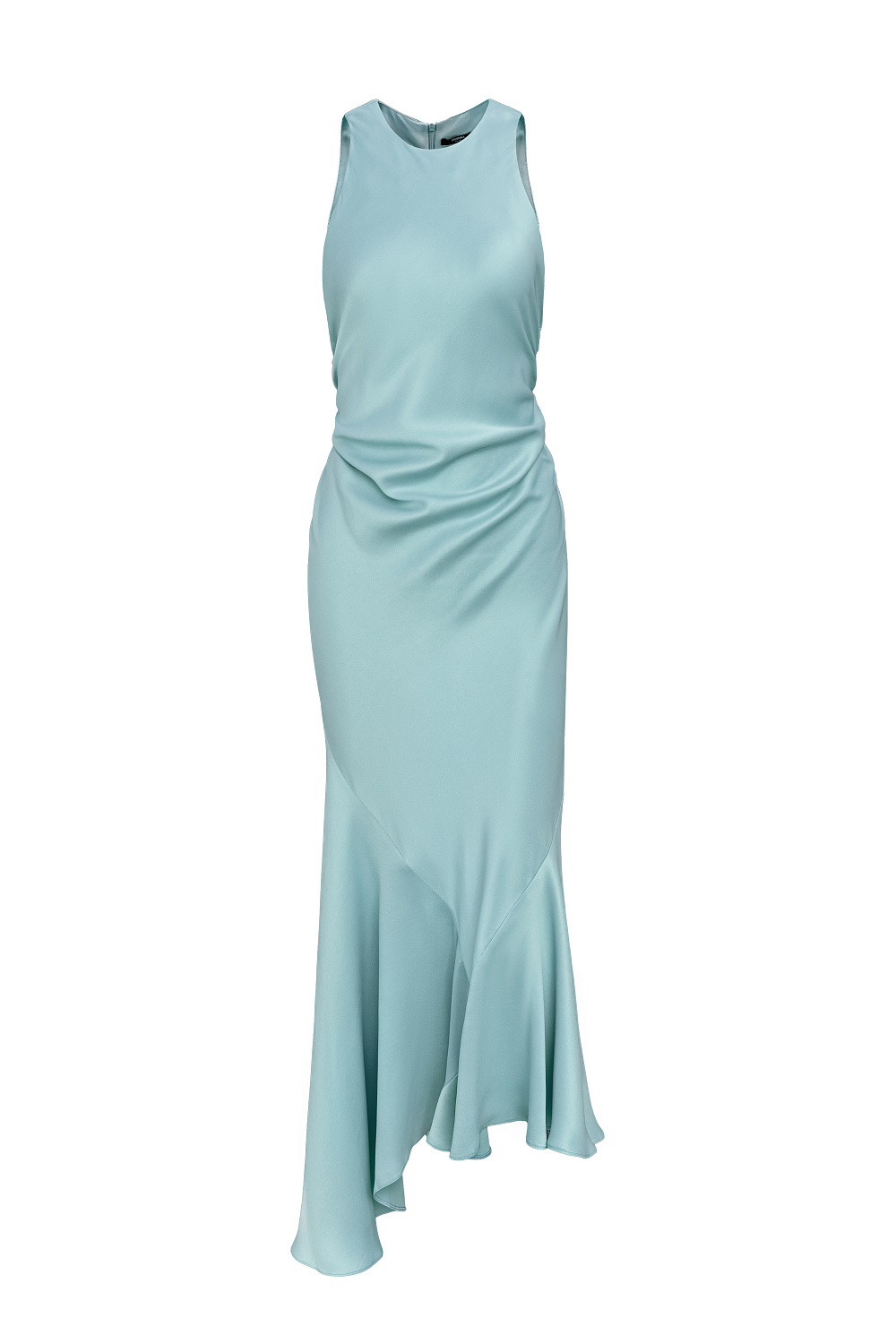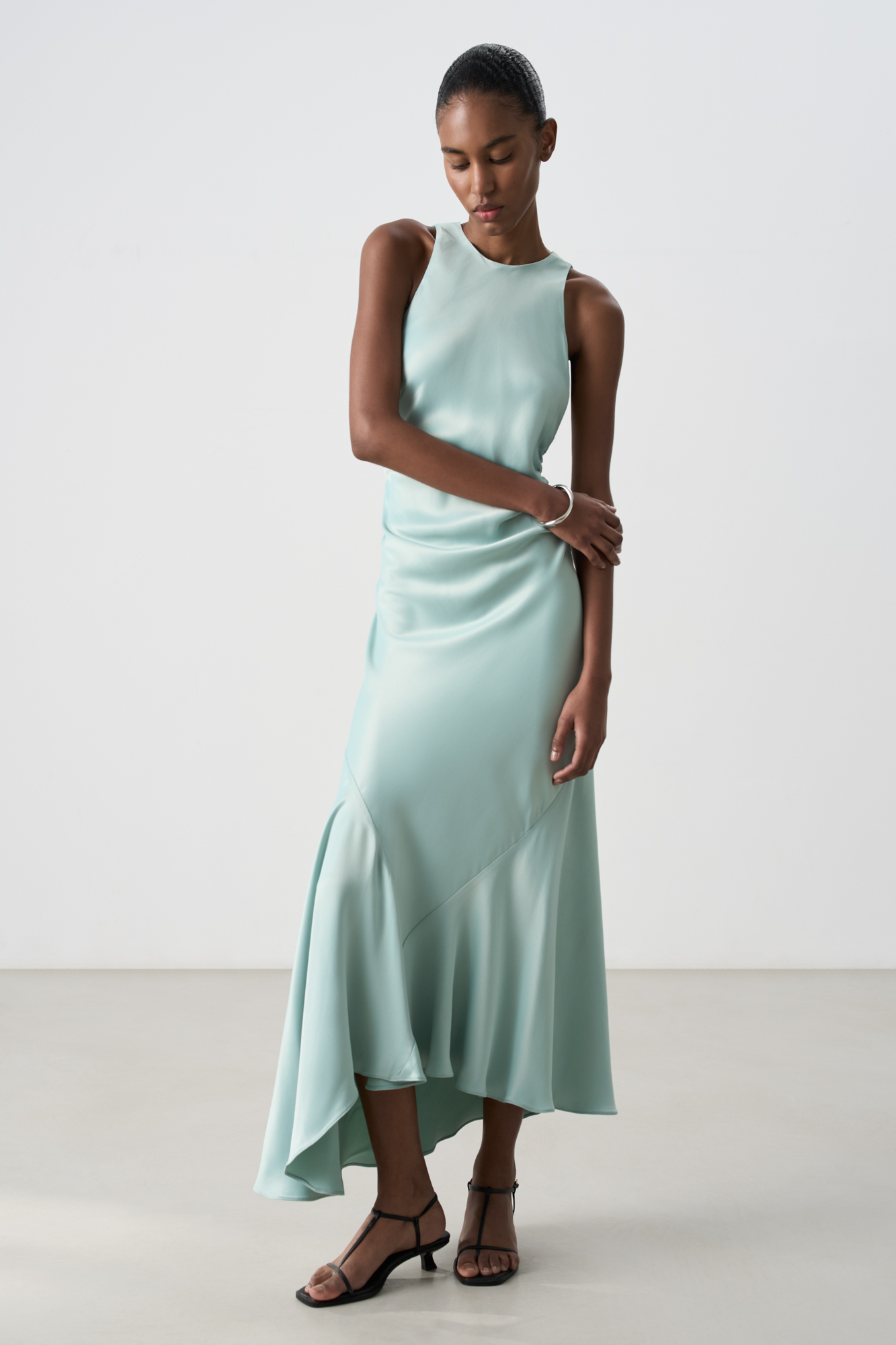 Satin midi dress with asymmetrical hem and gathered waist. Invisible zip fastening.