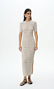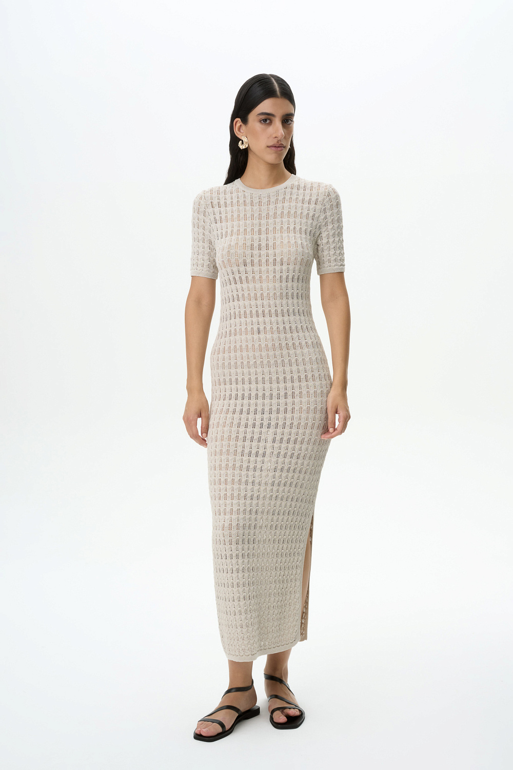 Fitted knit maxi dress with short sleeves, made entirely of openwork weave.