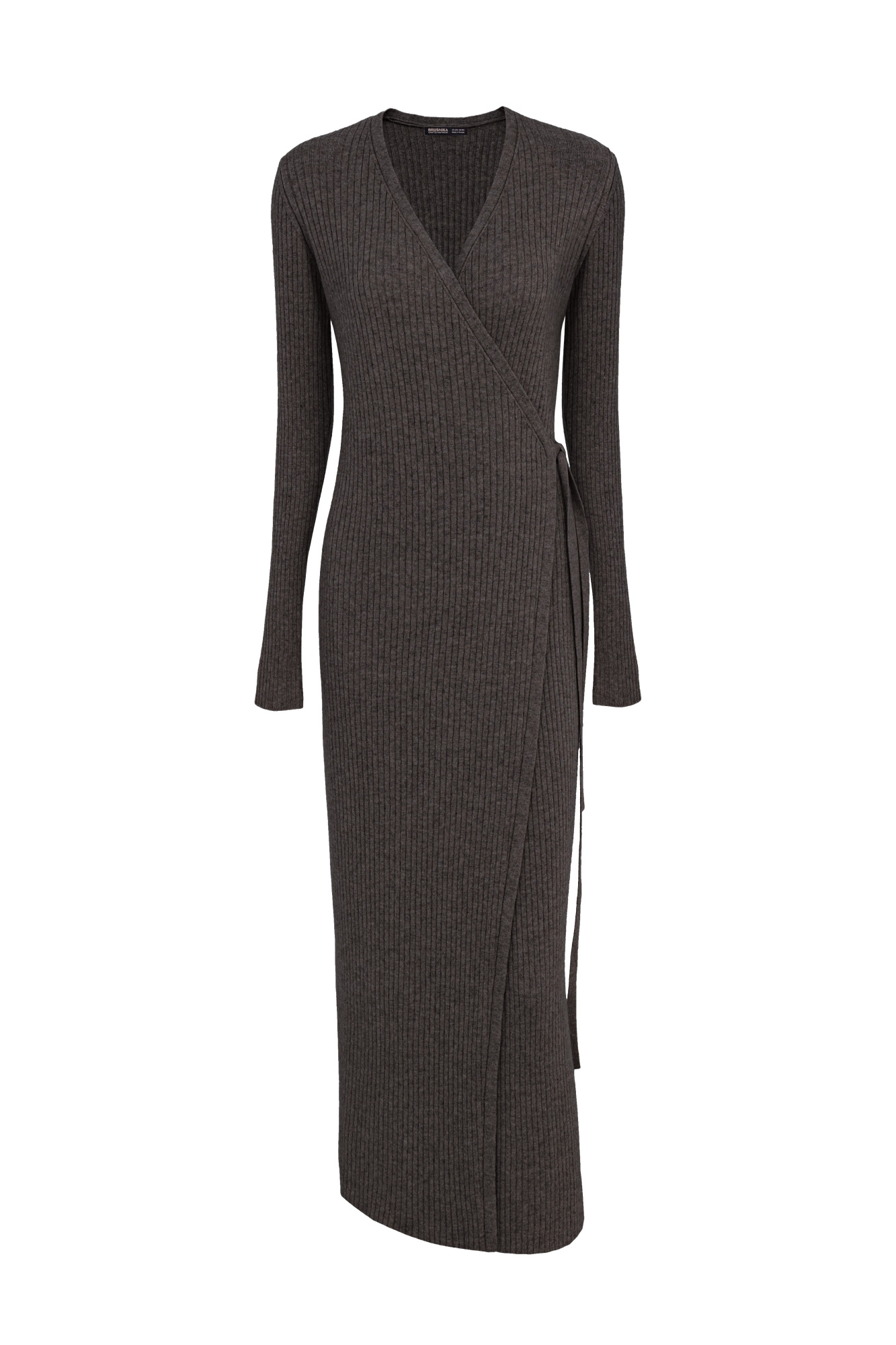 Maxi-length wrap dress made of wool and cashmere. Model with long flared sleeves, V-neck and belt. The product is made with a wide rib.