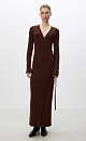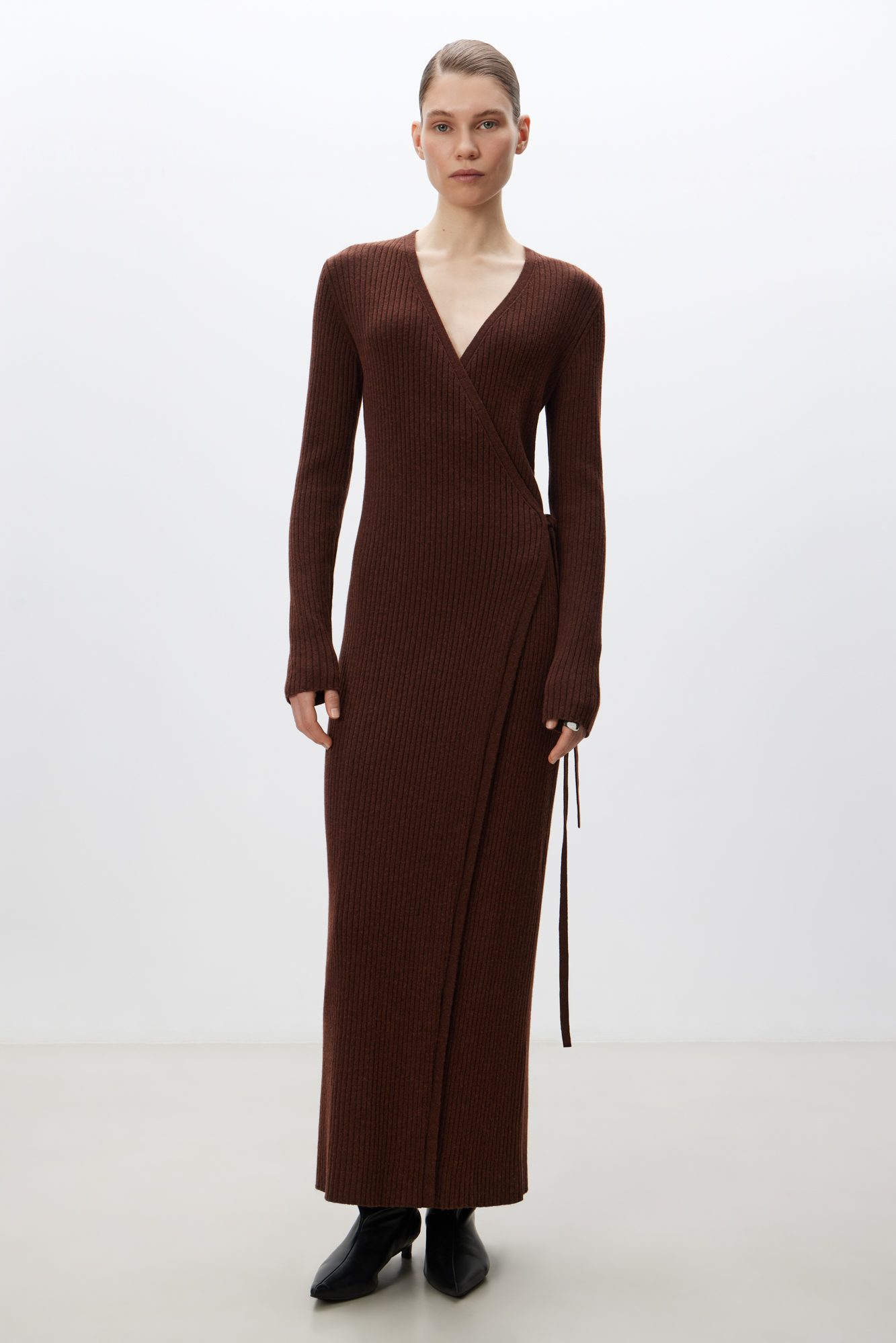 Maxi-length wrap dress made of wool and cashmere. Model with long flared sleeves, V-neck and belt. The product is made with a wide rib.