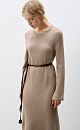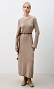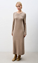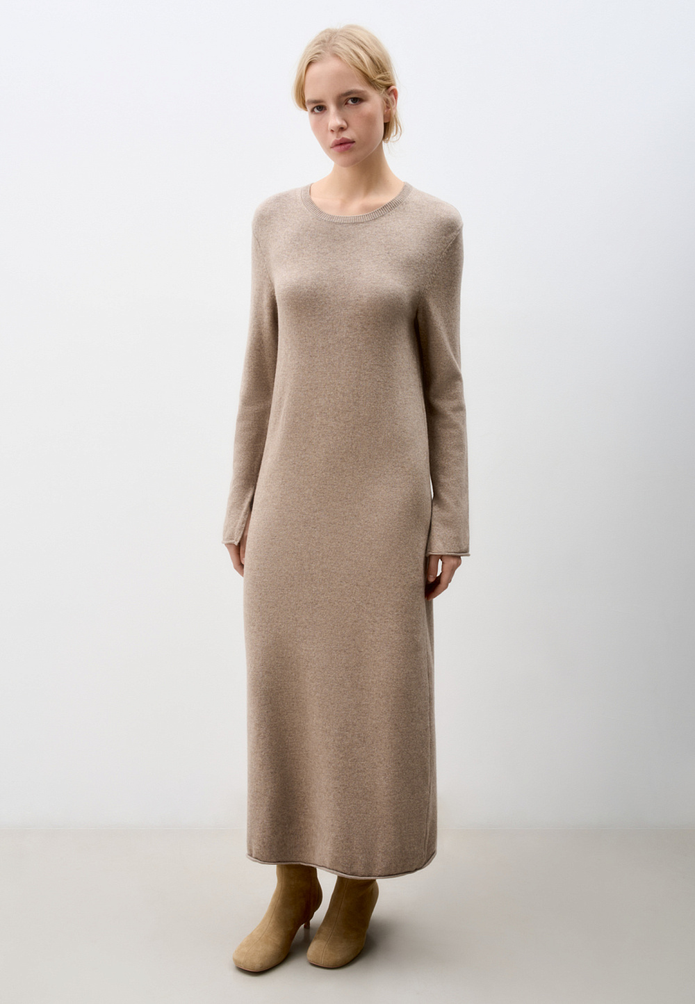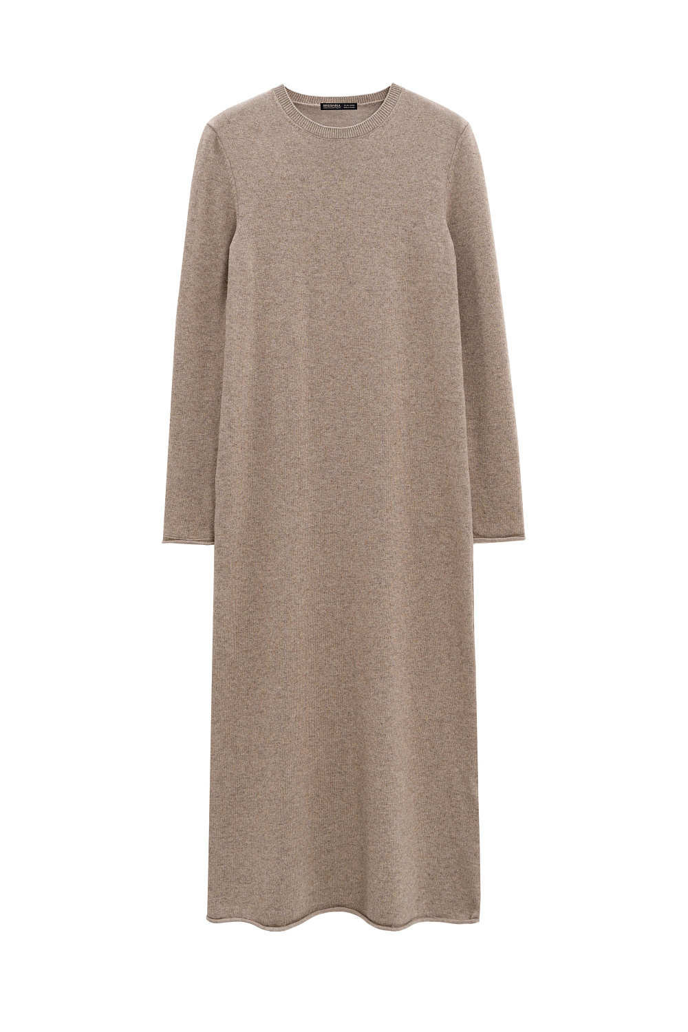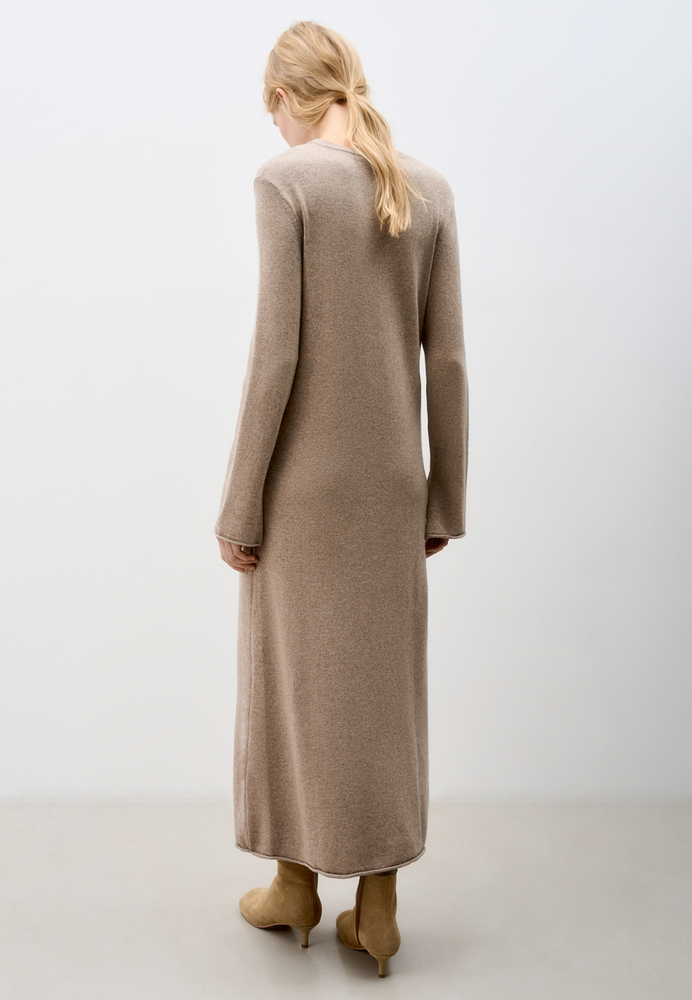 Knitted maxi dress made of wool with cashmere. The model has a loose silhouette with long sleeves, a round neckline and a roll at the bottom of the product.