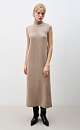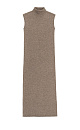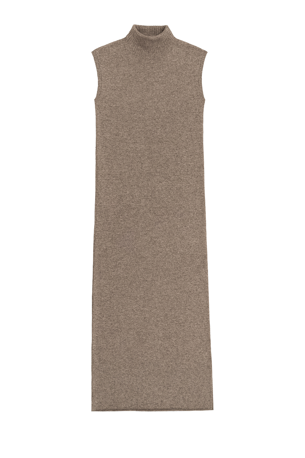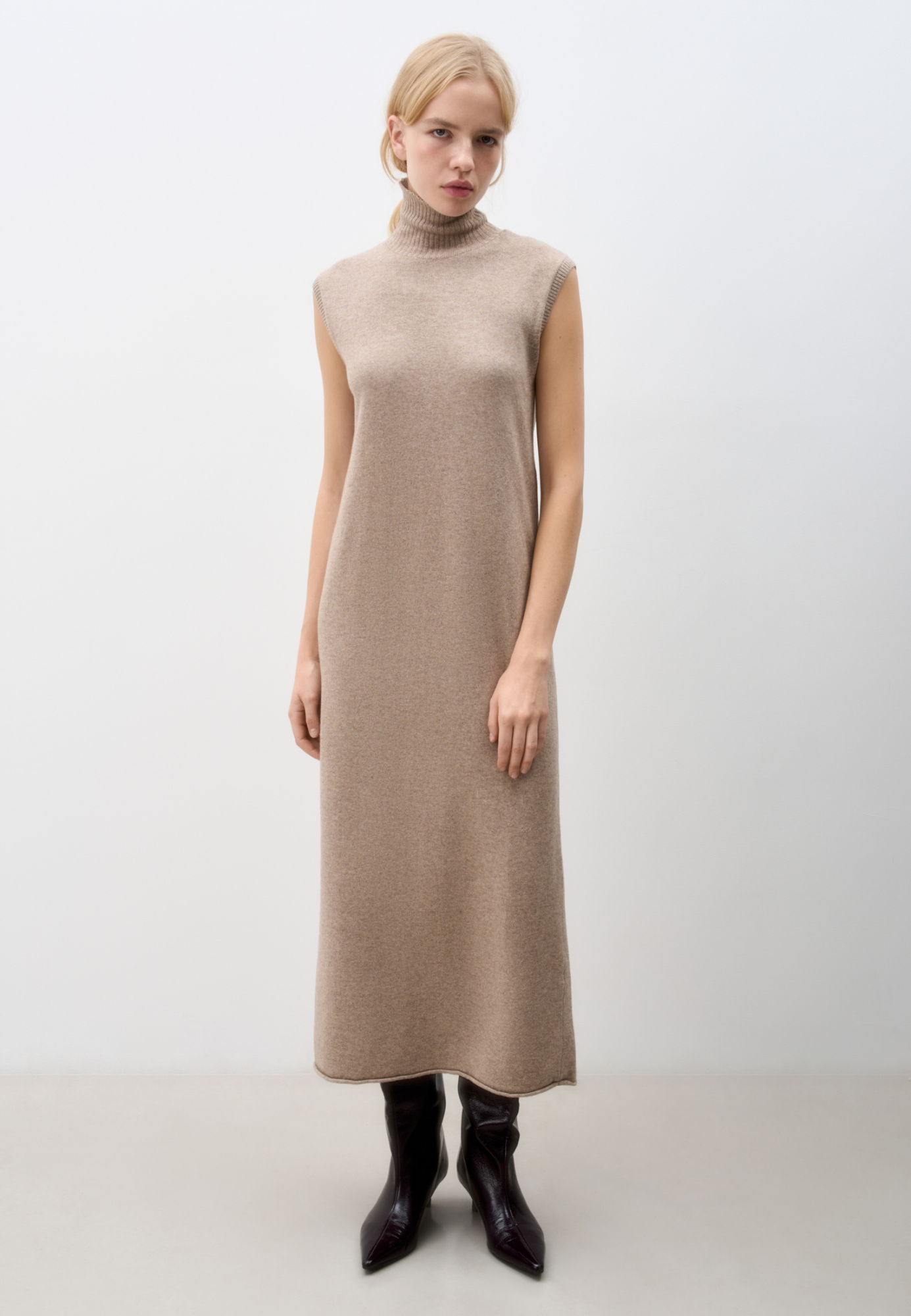 Knitted maxi dress made of wool and cashmere. The model has a straight cut, sleeveless and high collar.