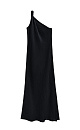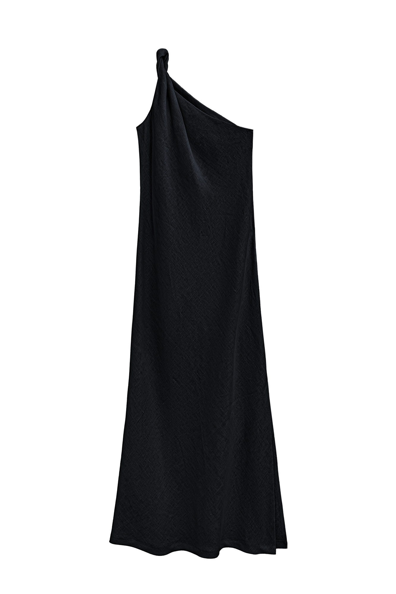 Maxi length dress made of 100% linen. The model has an asymmetrical cut, with a twisted strap on one shoulder. Side slit.