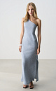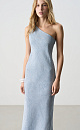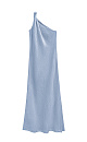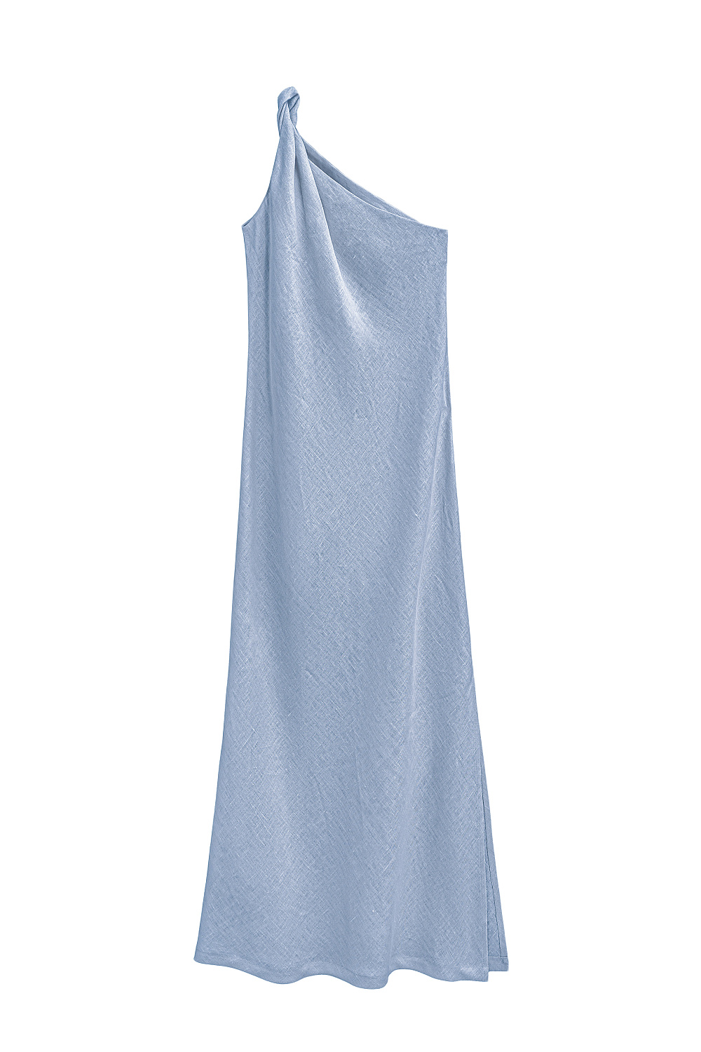 Maxi length dress made of 100% linen. The model has an asymmetrical cut, with a twisted strap on one shoulder. Side slit.