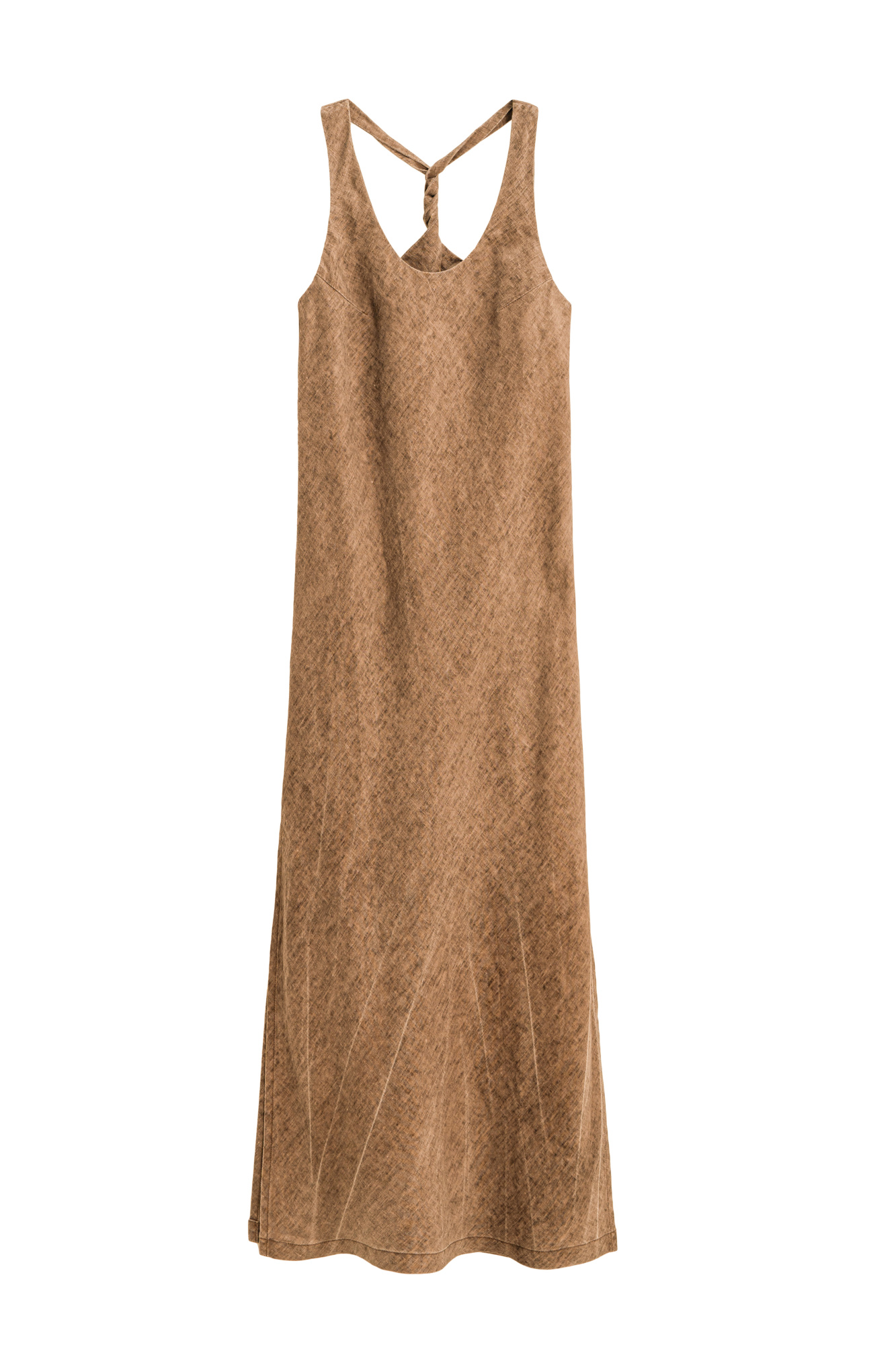 Sundress made of 100% linen, maxi length. The model has a loose silhouette, sleeveless, wide straps with a twist at the back, a U-neck and symmetrical slits on the sides of the skirt.