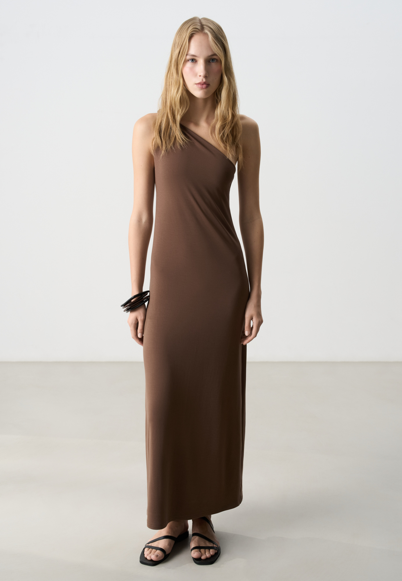 Maxi length dress in modal. The model has a loose fit, with an asymmetrical top and a twisted strap on one shoulder.