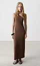 Maxi length dress in modal. The model has a loose fit, with an asymmetrical top and a twisted strap on one shoulder.