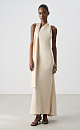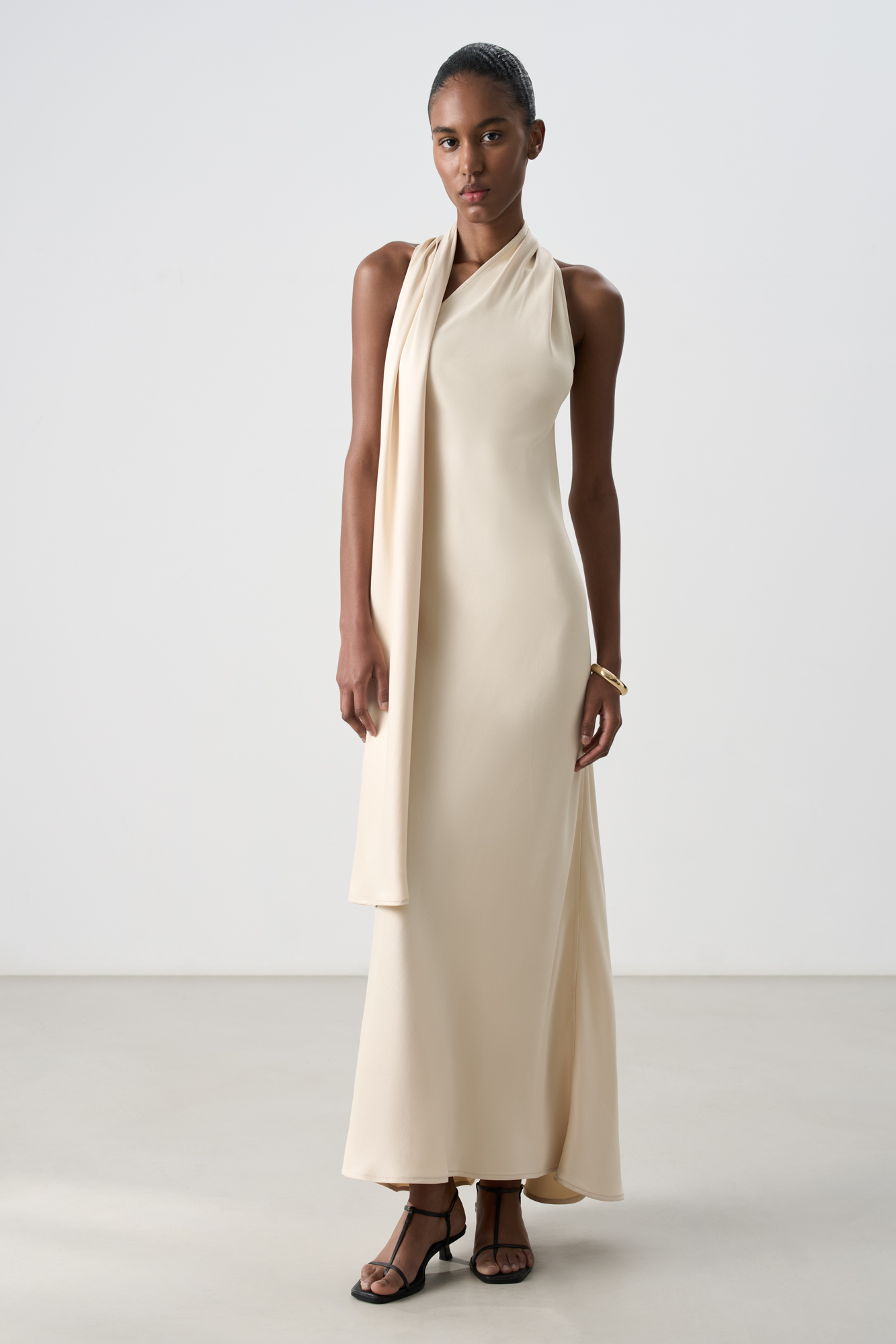A maxi-length satin viscose dress with a scarf. This fitted, sleeveless design features a halterneck that transitions into a stand-up collar with a buttoned back closure.
