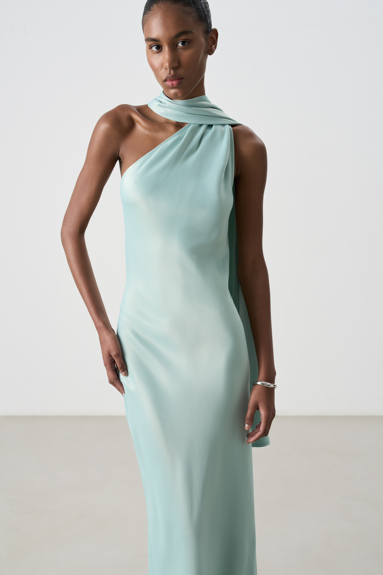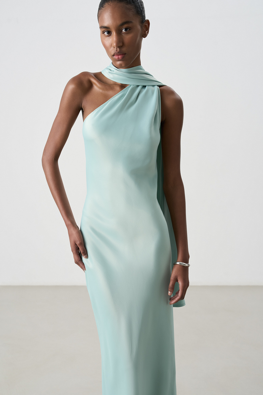 A maxi-length satin viscose dress with a scarf. This fitted, sleeveless design features a halterneck that transitions into a stand-up collar with a buttoned back closure.
