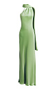 A maxi-length satin viscose dress with a scarf. This fitted, sleeveless design features a halterneck that transitions into a stand-up collar with a buttoned back closure.