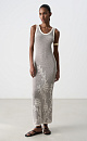 Knitted maxi dress made of 100% cotton. The model has a straight cut, sleeveless, thin straps and a deep neckline. The product is decorated with voluminous floral patterns. The edges are ribbed.
