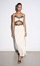 Satin maxi length dress decorated with lace. The model has a fitted silhouette with thin straps, an open back and a cutout under the bust. Concealed zip fastening.