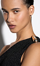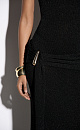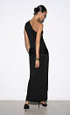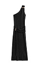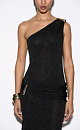 Maxi-length evening dress made of viscose with lurex. Model with an asymmetrical cut. The product is decorated with a wide jumper on the shoulder and a draped bandage on the hips.