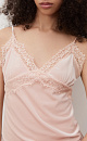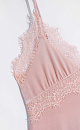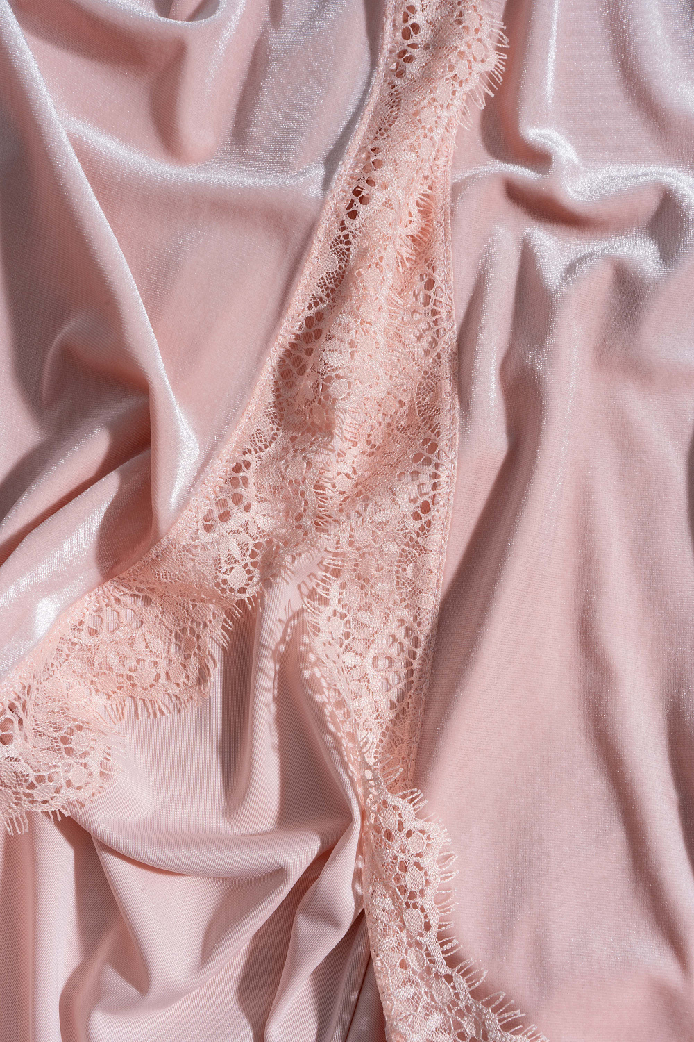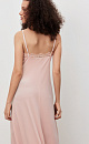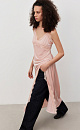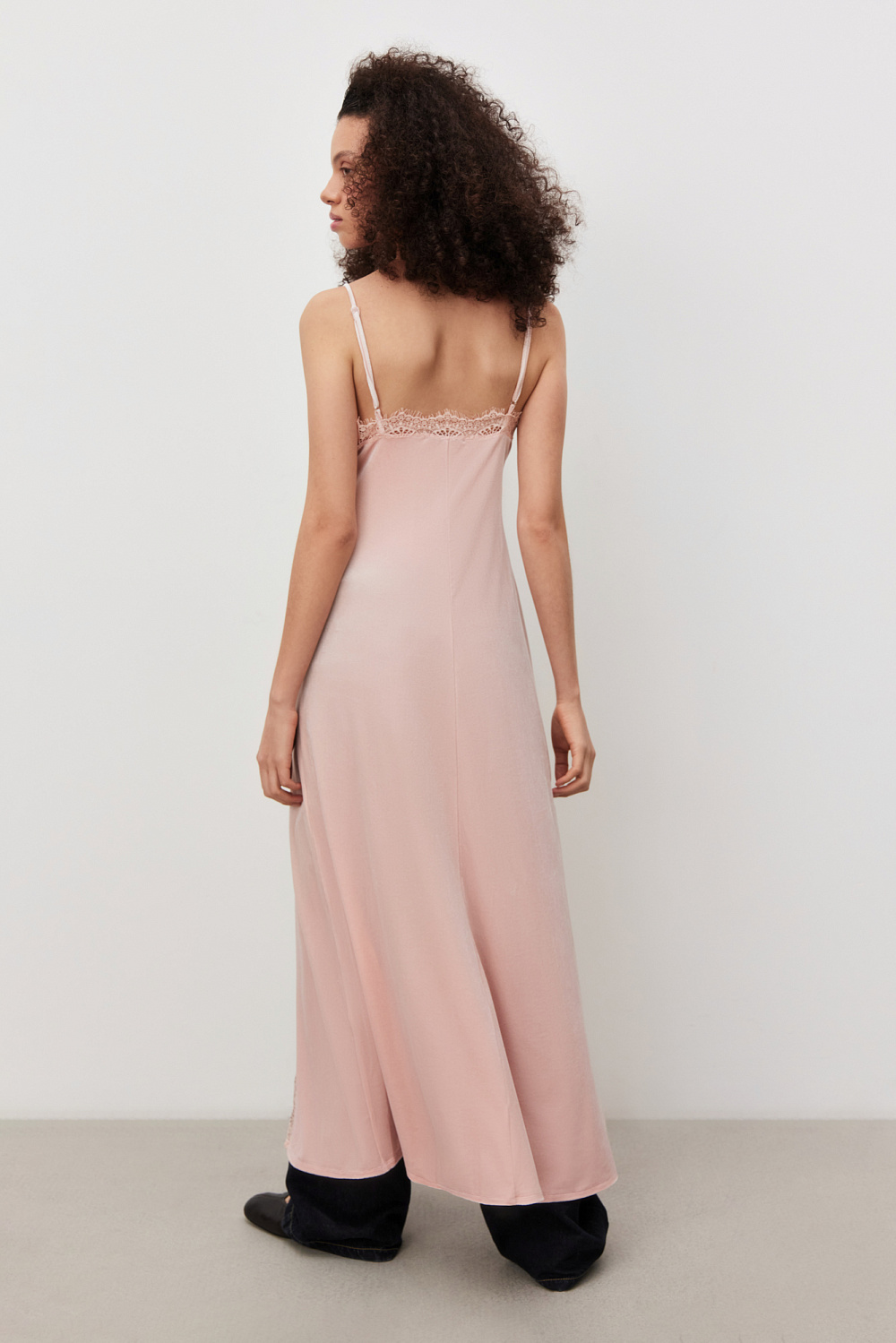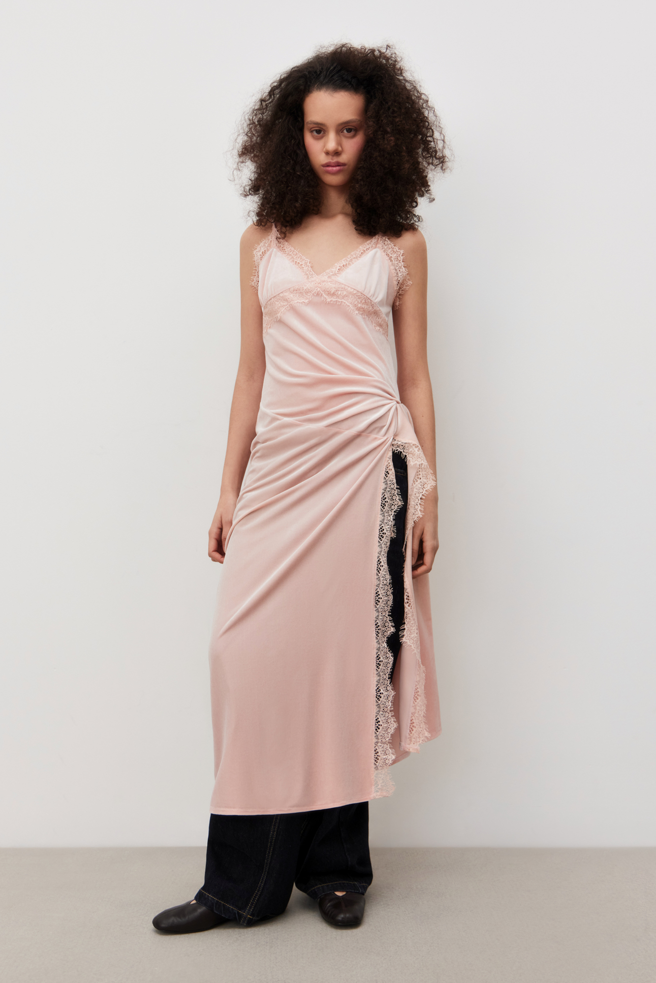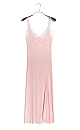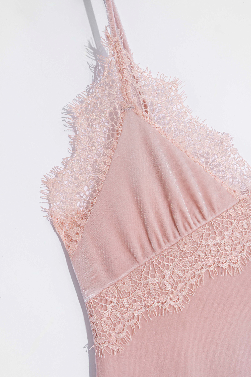 Maxi length slip dress in velvet viscose. The model has a fitted silhouette with thin straps and a high slit on the side. The product is decorated with lace.