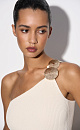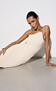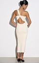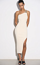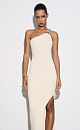 One shoulder maxi dress. The item is ribbed and decorated with an accent element on the shoulder and a twist on the back. Fitted silhouette with a front slit.