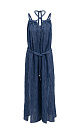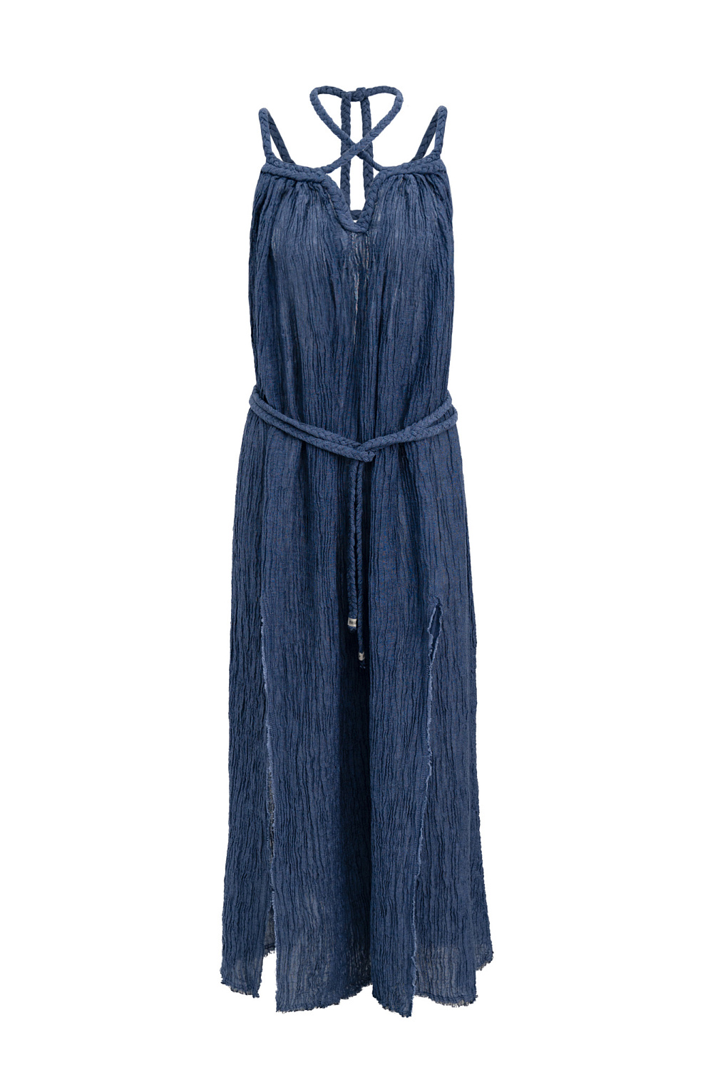 Linen midi sundress with front slits. Features loose silhouette and a tie belt.