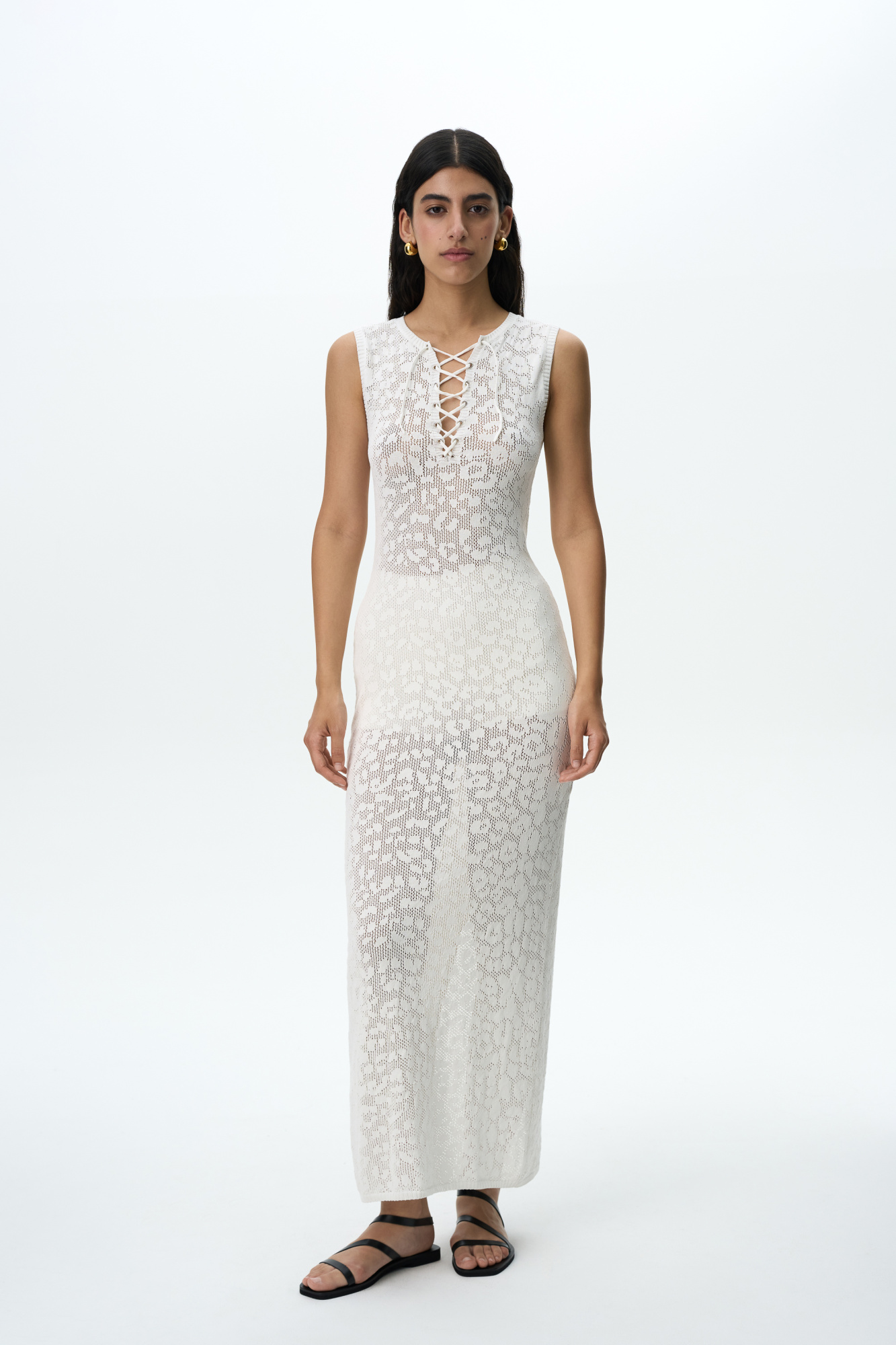 Openwork cotton sundress with lacing on the chest and a slit at the back.