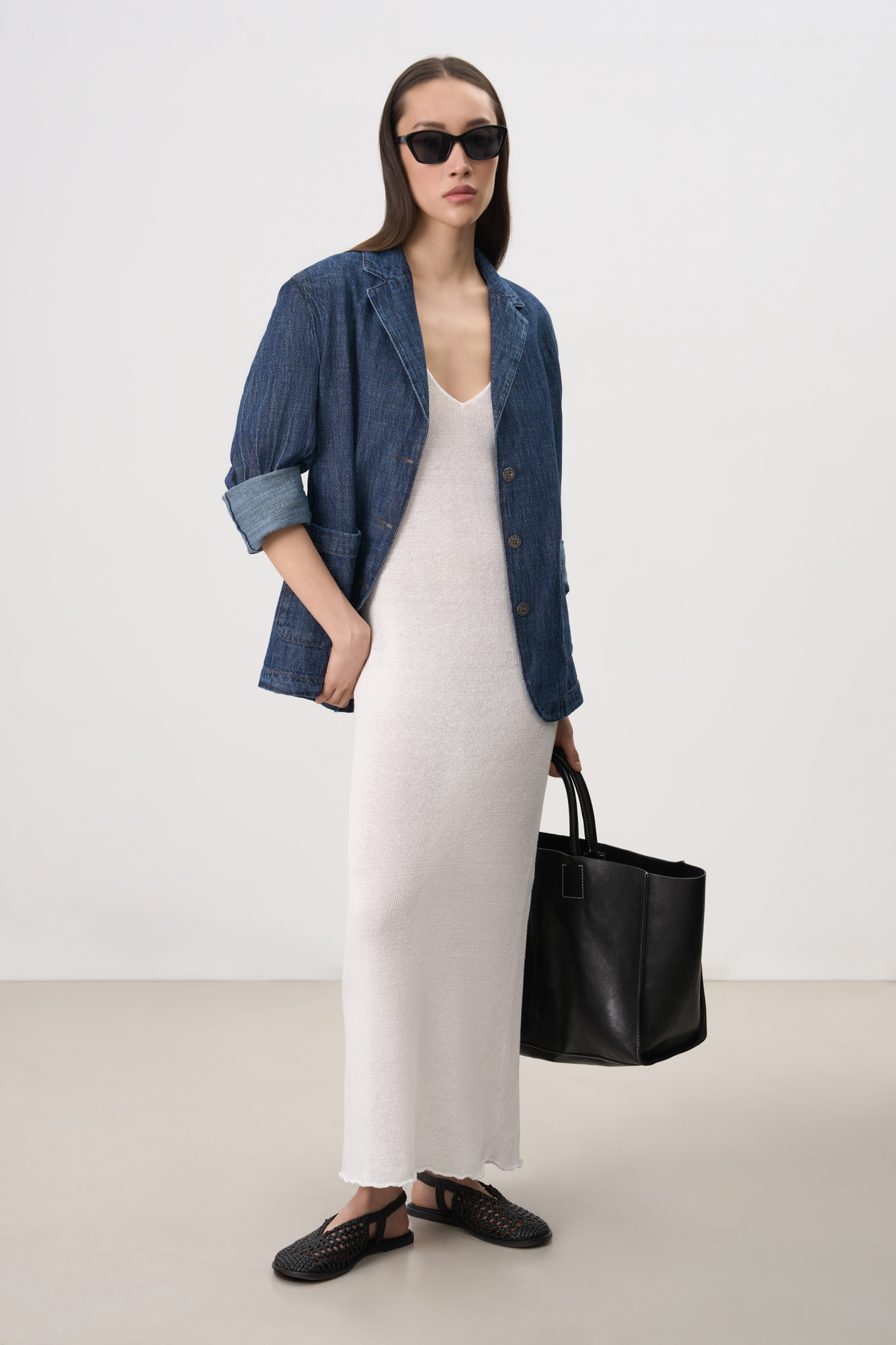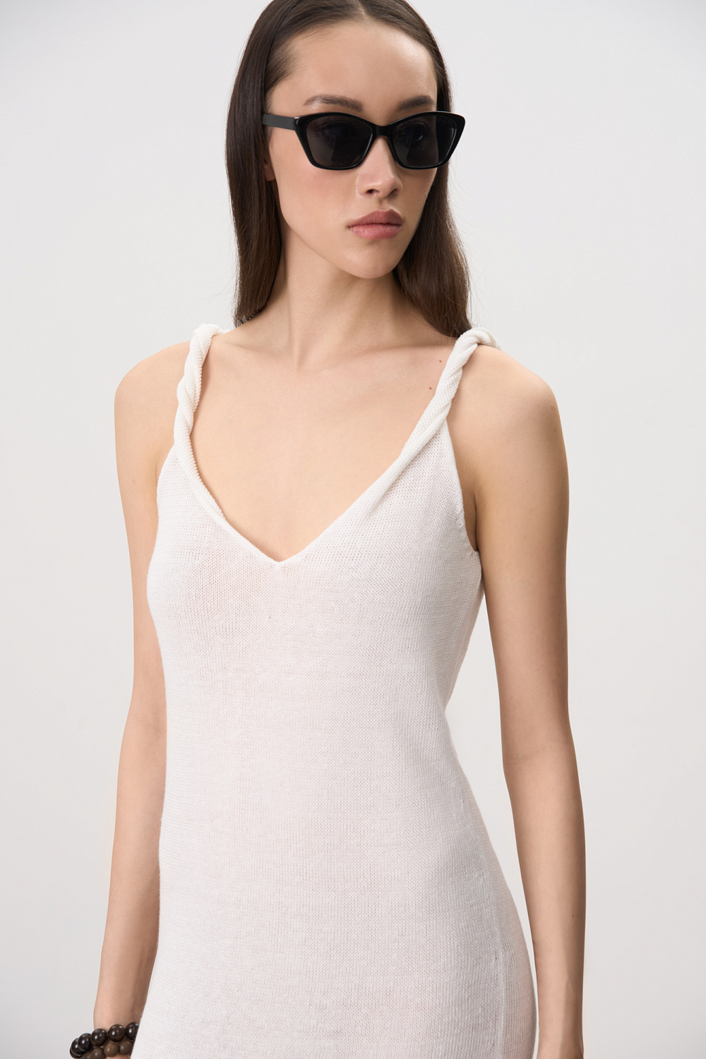 Maxi length sundress made of 100% linen. Straight fit model with twisted straps and V-neck.